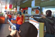 Outros dois homens, de 48 e 41 anos, aperceberam-se do roubo e, já no exterior do estabelecimento, perseguiram o gang; um dos ladrões ripostou disparando. Os dois homens foram atingidos, mas sofreram apenas ferimentos ligeiros. O carro usado pelo gang na fuga foi encontrado esta quinta-feira, abandonado em Alfornelos, na Amadora.