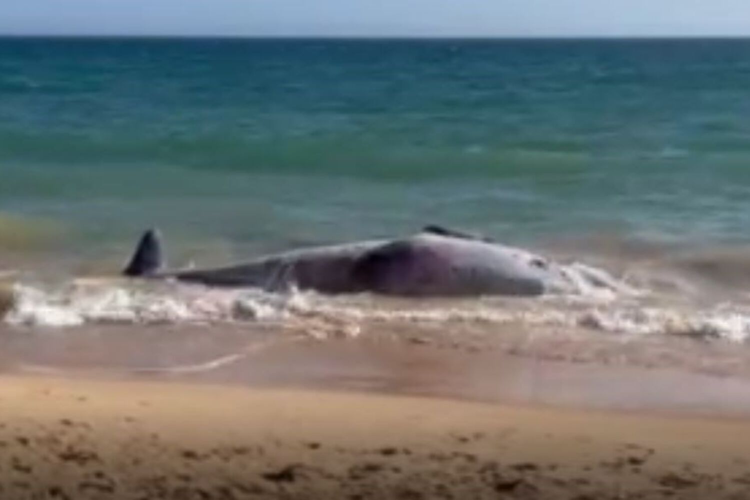 Cetáceo morto tinha encalhado este domingo na Praia dos Salgados, mas o animal foi de novo arrastado para o mar.