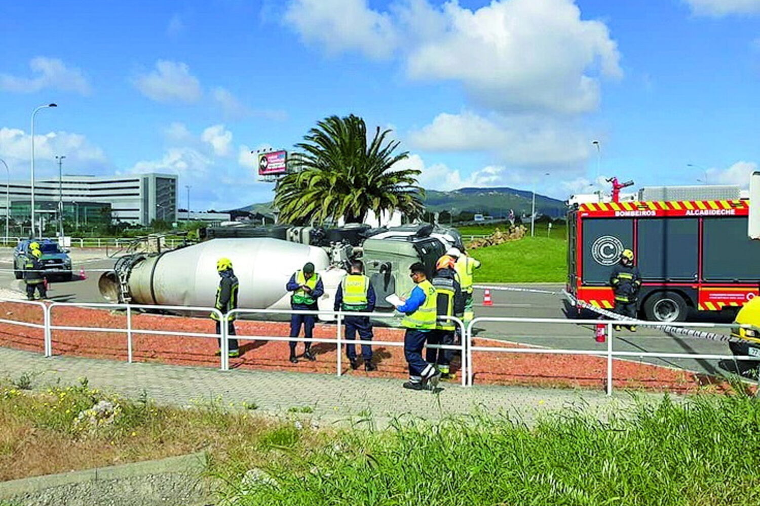 O acidente ocorreu pelas 10h55. O pesado, que transportava 24 toneladas de betão, não conseguiu contornar a rotunda e acabou por tombar. Para o local foram mobilizados 12 operacionais dos Bombeiros de Alcabideche, com o apoio da GNR.