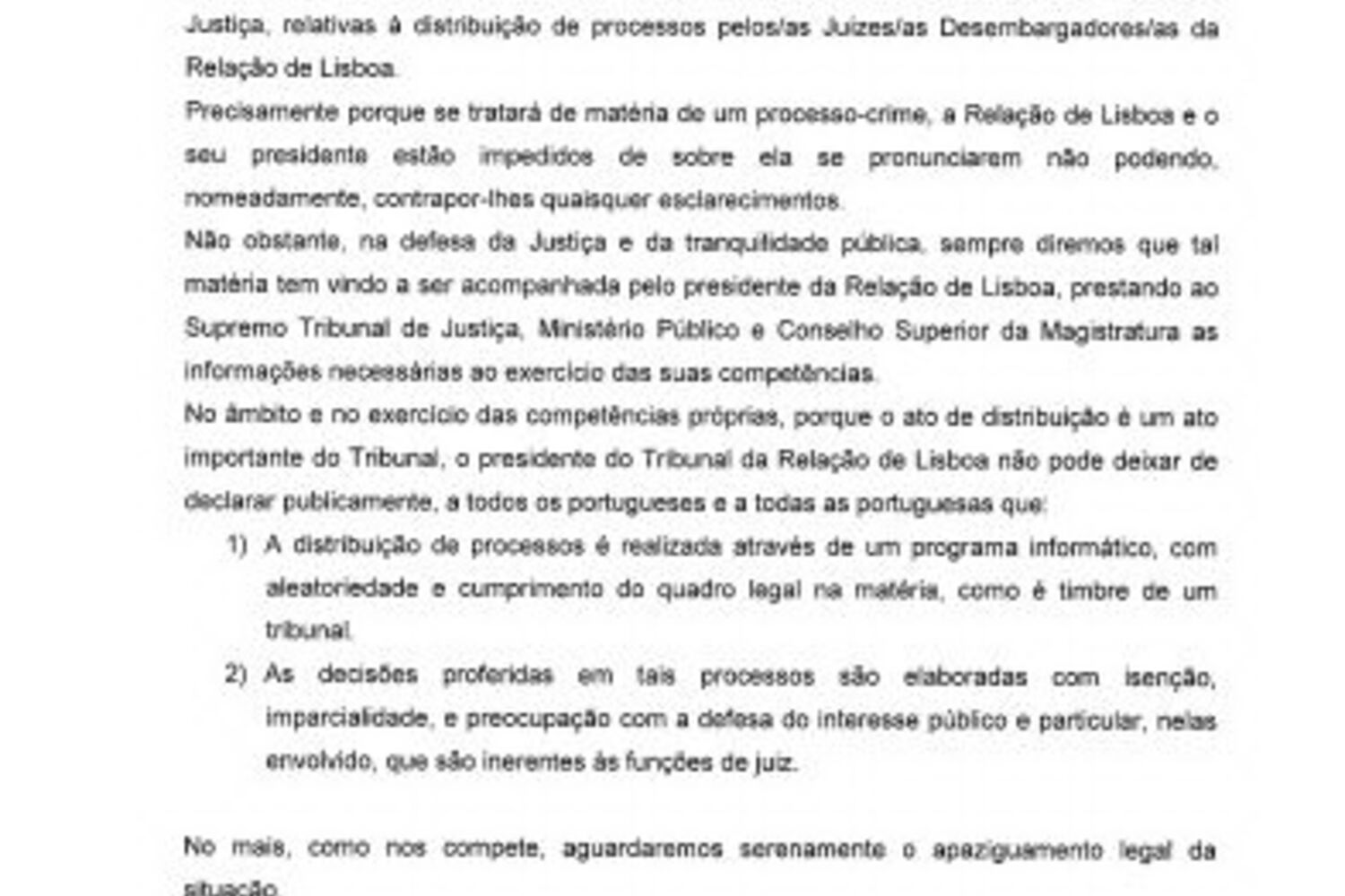 O Presidente do Tribunal da Relação de Lisboa, esclareceu que o ato de distribuição de processos "é realizada através de um programa informático, com aleatoriedade e cumprimento do quadro legal na matéria".