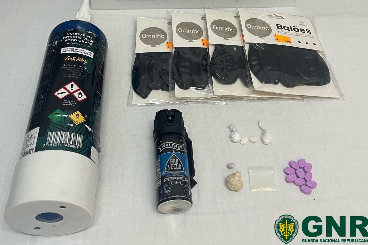 Nas buscas realizadas à viatura, foram apreendidas dez doses de cocaína, 76 doses de MDMA e gás pimenta.