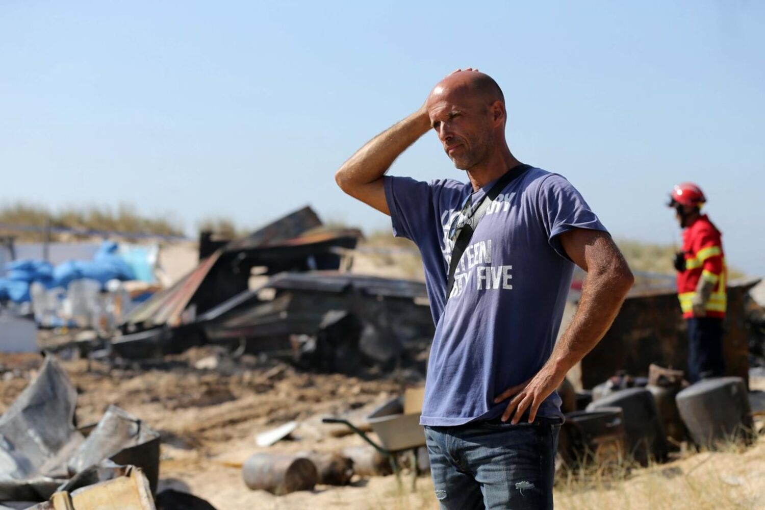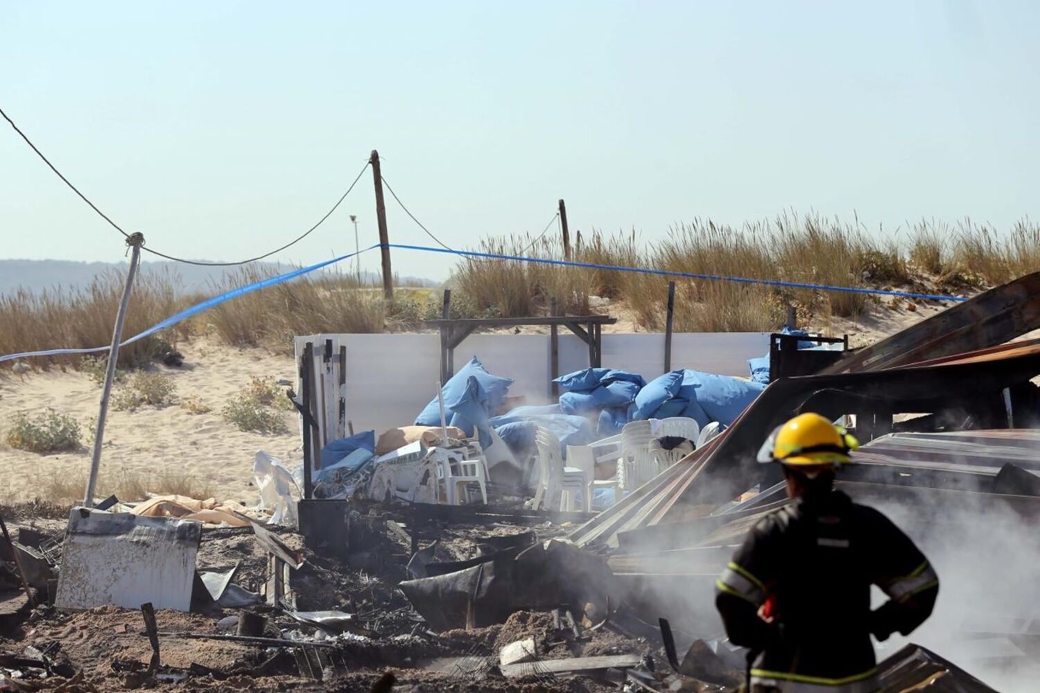 De mãos na cabeça e com o olhar fixo num amontoado de cinzas, Luís Mendes assiste aos trabalhos de rescaldo dos Bombeiros de Cacilhas, chamados pelas 03h15 de ontem, para extinguir as chamas no bar Unik Lounge, na praia da Mata, Costa da Caparica.