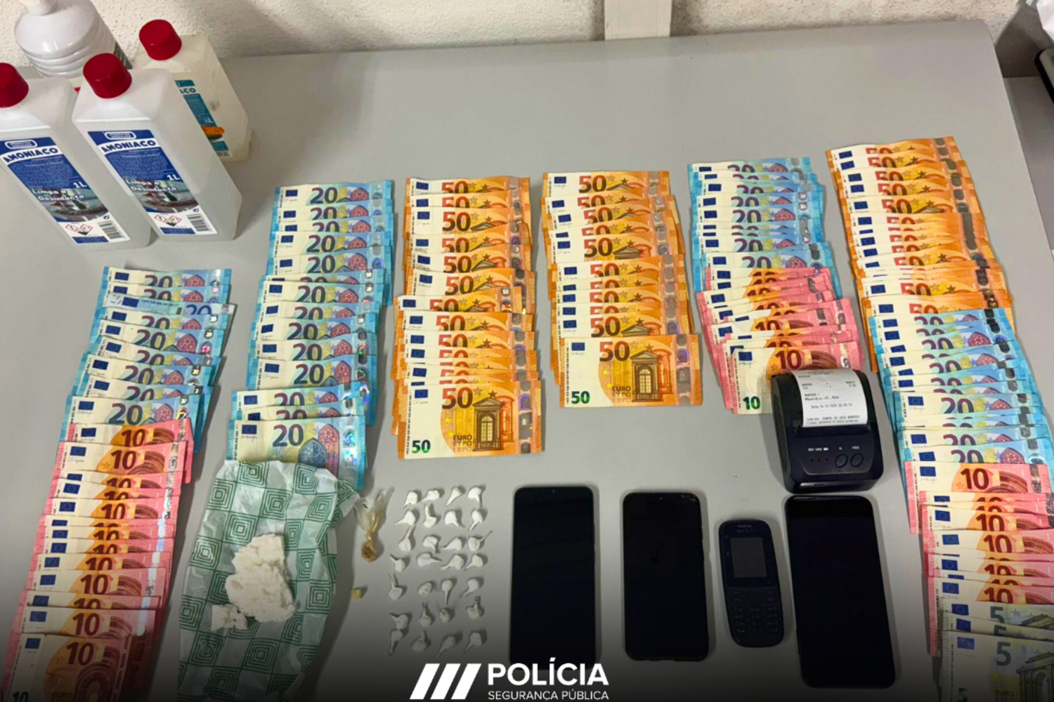 Com antecedentes criminais, o suspeito acabou detido nos últimos dias. Após seis buscas domiciliárias e não domiciliárias, a PSP apreendeu-lhe 231,95 doses de cocaína, 7,80 de ecstasy, 3575 euros, 4 telemóveis, uma máquina para registo do 'Jogo do Bicho', e material químico para transformar droga.