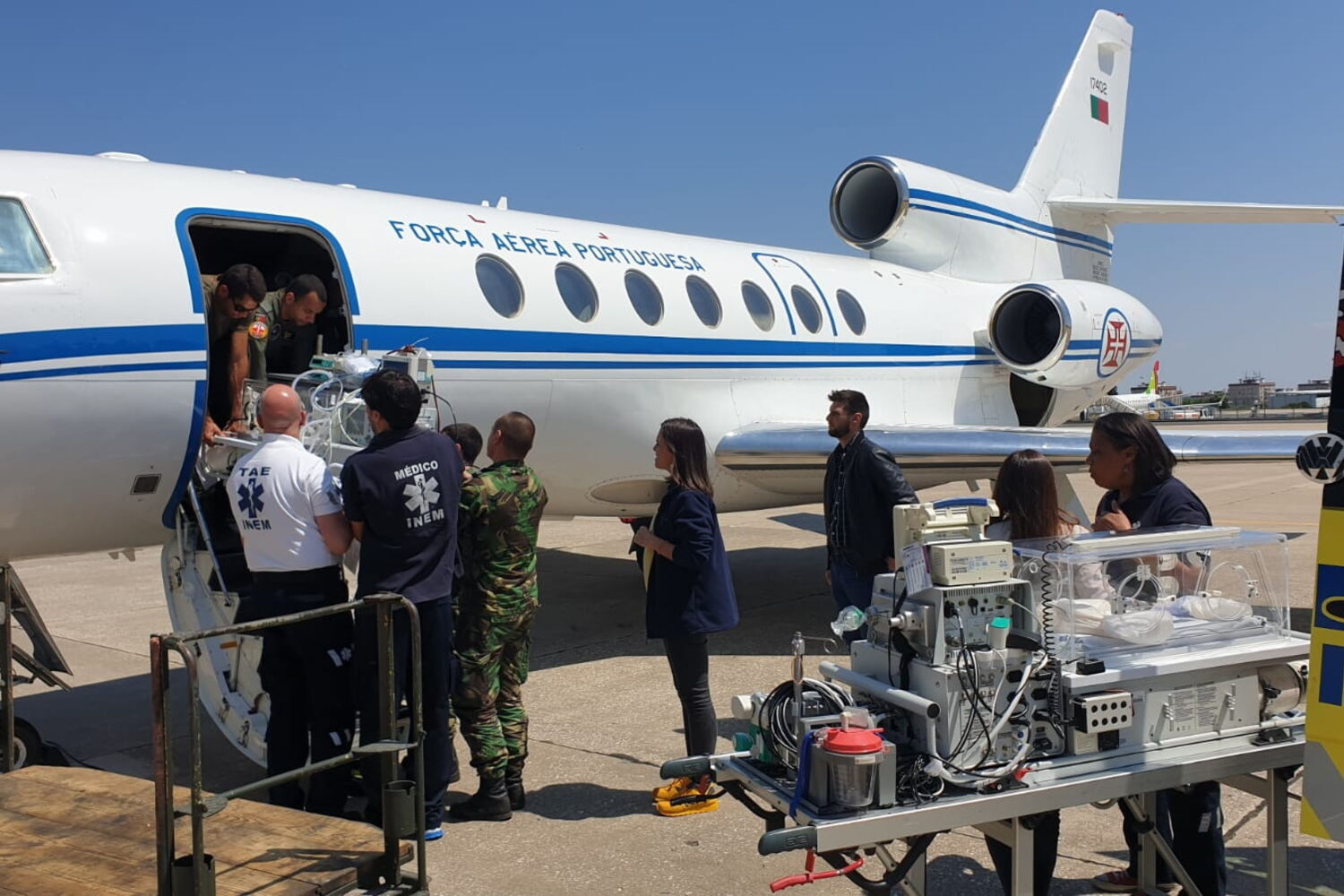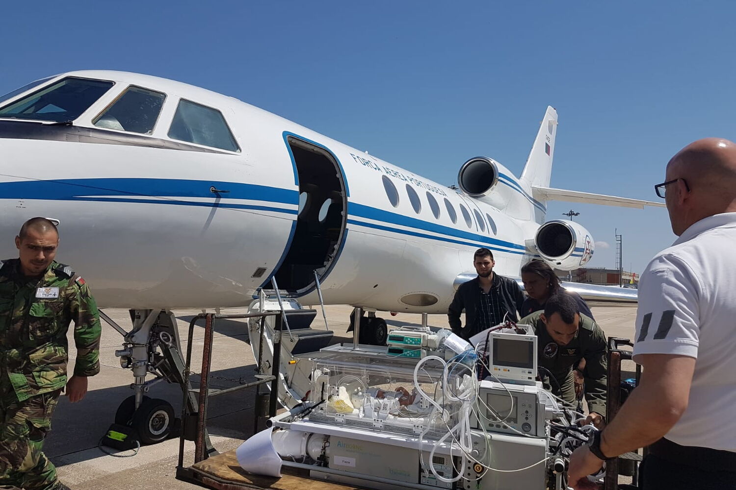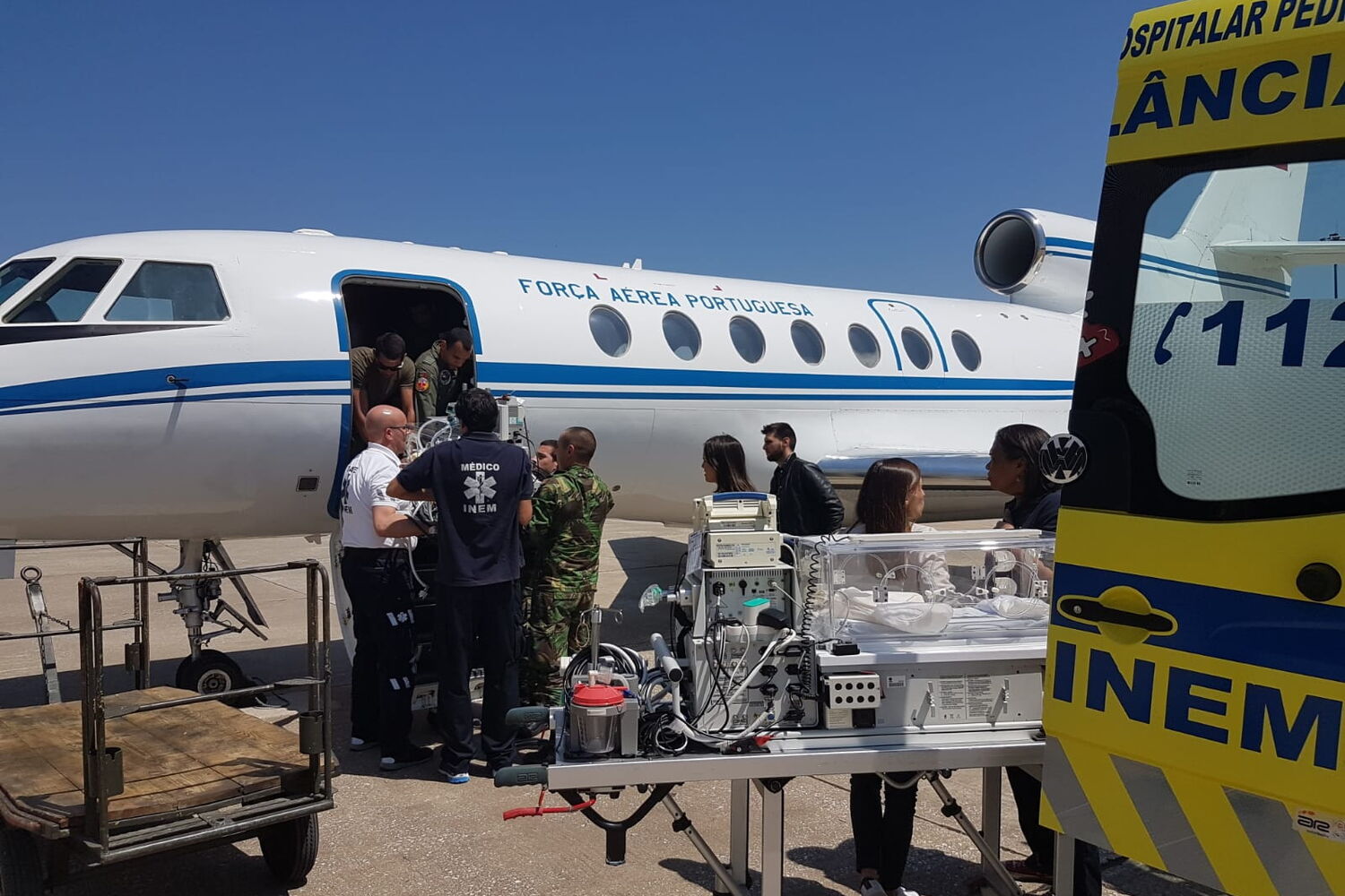 A bordo com a Esquadra 504 – "Linces" – de modo a garantir todos os cuidados durante a viagem – seguiu uma equipa médica militar e civil.À chegada a Lisboa, o bebé foi transferido para uma equipa de transporte inter-hospitalar pediátrico do INEM.