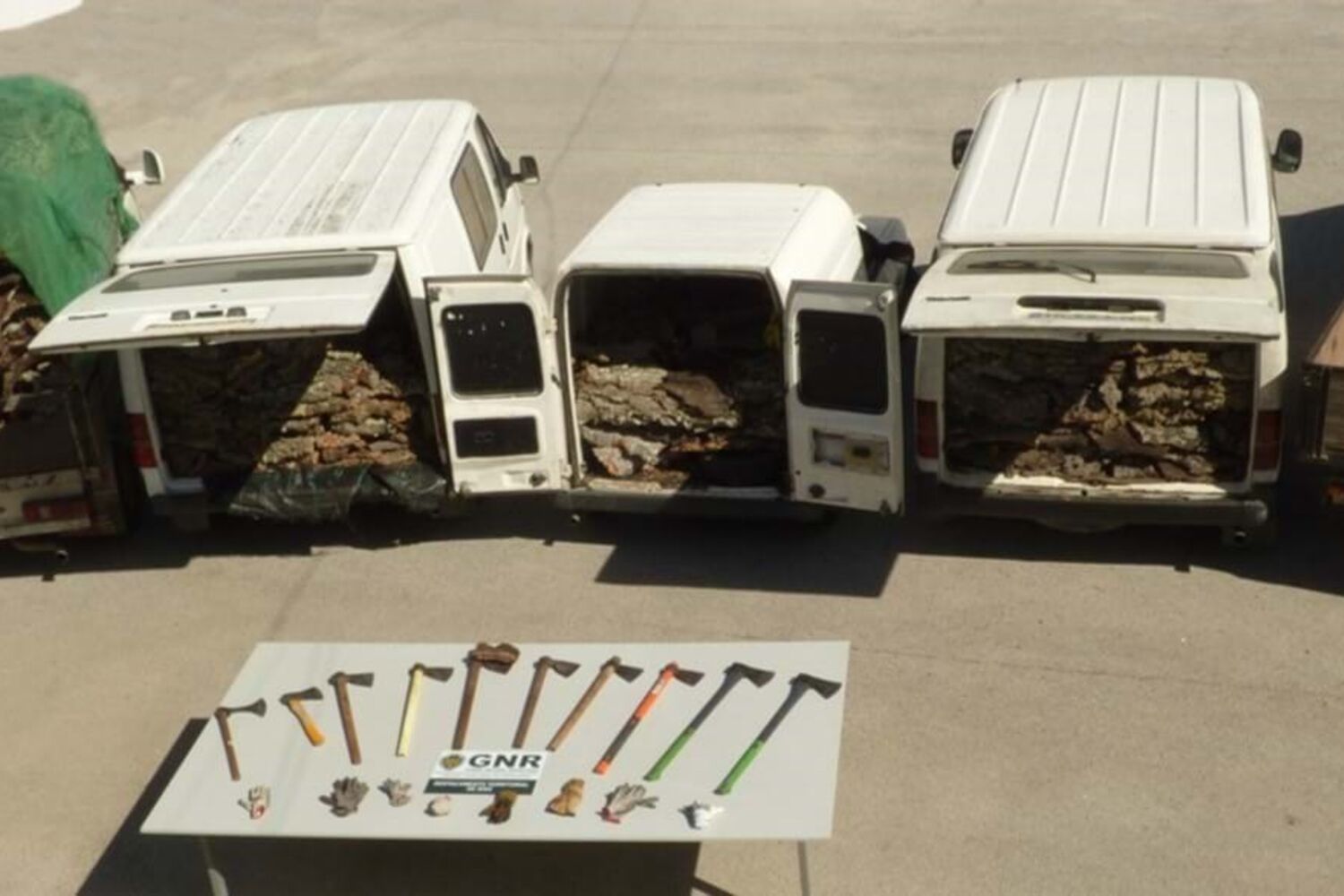 Além dos 2800 quilos de cortiça, a GNR apreendeu ainda cinco veículos,10 machados para extração de cortiça e oito pares de luvas de trabalho.