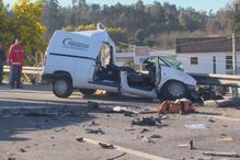 Uma mulher grávida de poucas semanas sofreu ontem ferimentos graves numa violenta colisão frontal envolvendo um ligeiro de passageiros e dois pesados de mercadorias, de que resultou ainda a morte do marido. O acidente ocorreu ao quilómetro 72 do IP 3, em Almaça, Mortágua, e causou a interrupção do trânsito nos dois sentidos mais de seis horas.