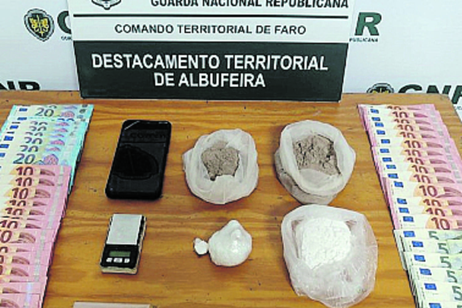 A GNR deteve um homem, de 54 anos, por tráfico de estupefacientes e que tinha pendente um mandado de detenção depois de cortar a pulseira eletrónica que monitorizava a prisão domiciliária a que estava sujeito. Foram apreendidas 2731 doses de heroína e 866 doses de cocaína. Foi para a prisão de Silves.