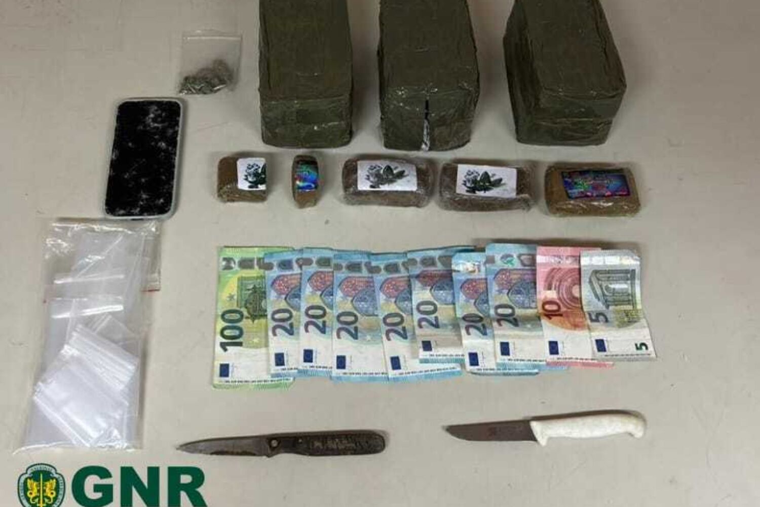 Depois de dado o alerta, o suspeito foi abordado pela patrulha da GNR de Lourosa. Durante as diligências, a autoridade apreendeu, na sequência de uma busca domiciliária, 6924 doses de haxixe, 255 euros em numerário, 12 doses de cocaína, duas doses de liamba e diverso material contado com o tráfico de estupefacientes.