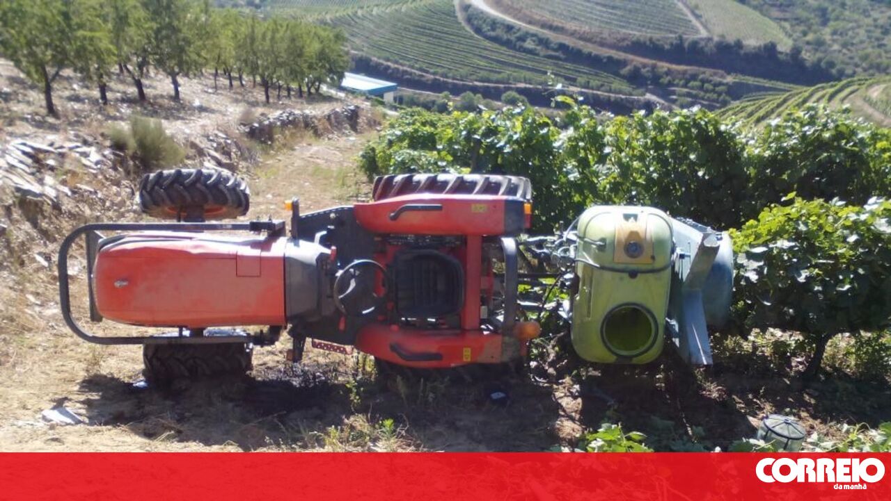 O trator capotou e caiu por cima do condutor.