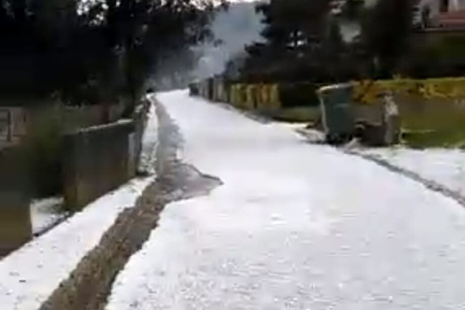 O combate ao incêndio foi interrompido por uma queda de granizo, que causou também uma acumulação de gelo de 6 a 7 centímetros nas ruas.