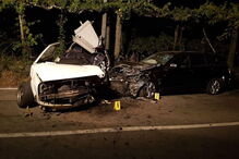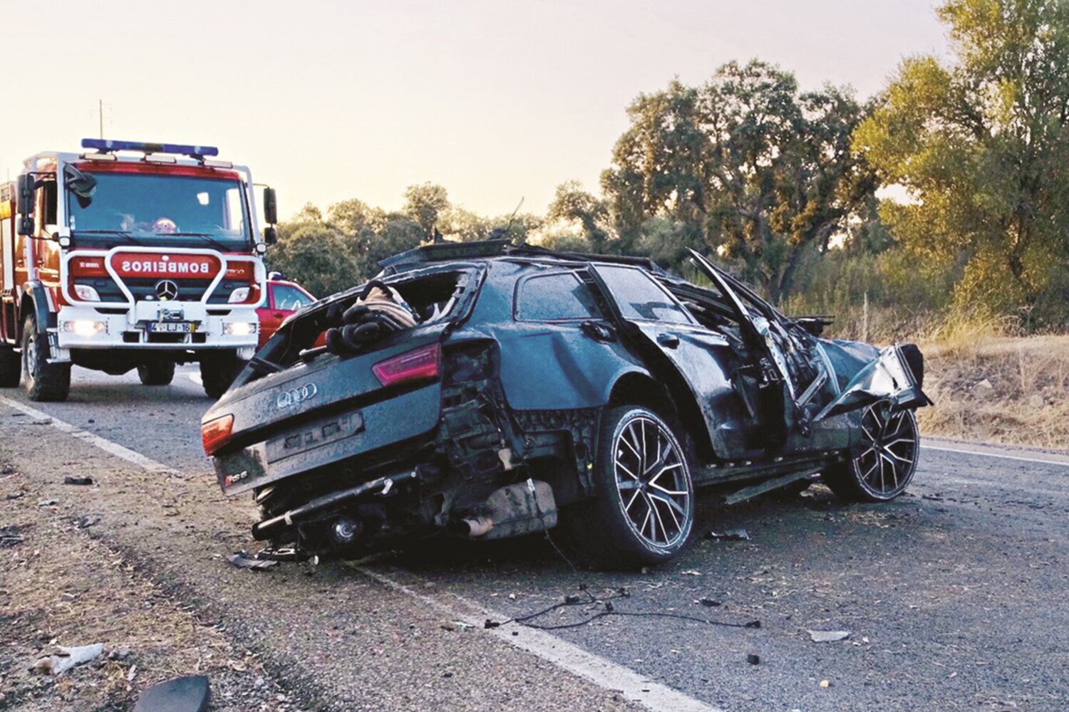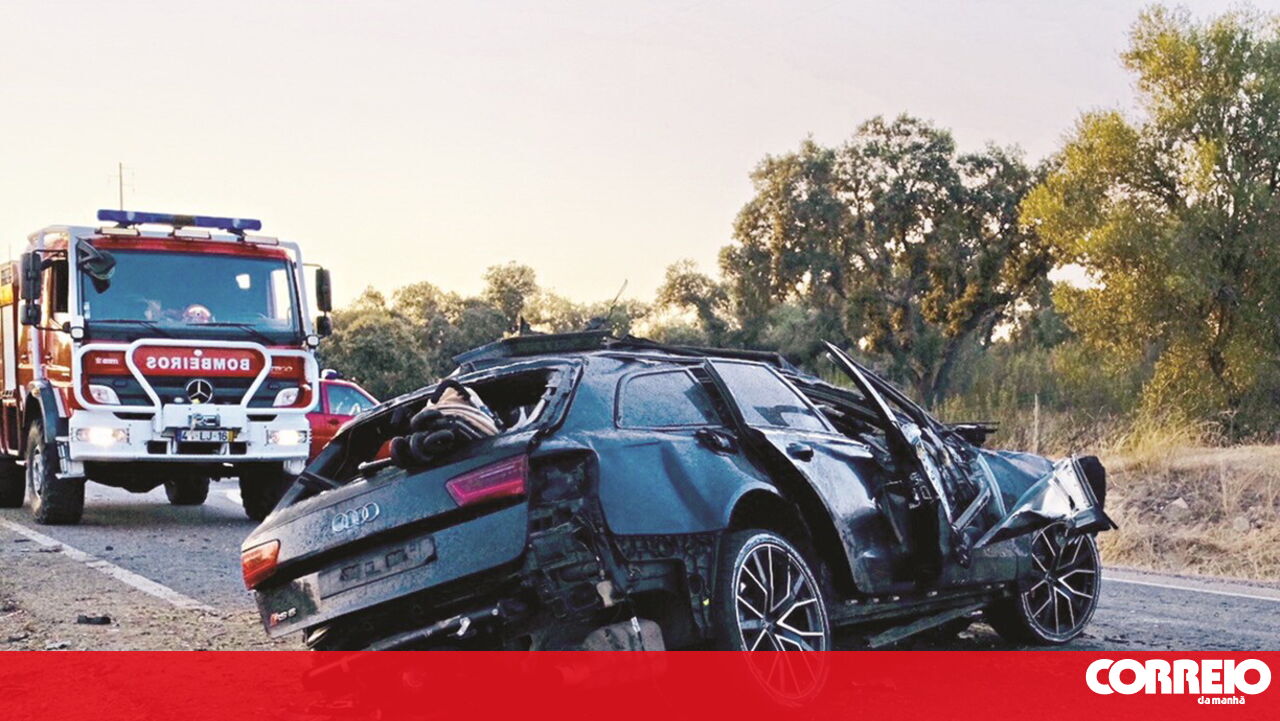 Três homens num Audi com matrícula alemã foram projetados do carro, que se incendiou ao embater numa árvore.