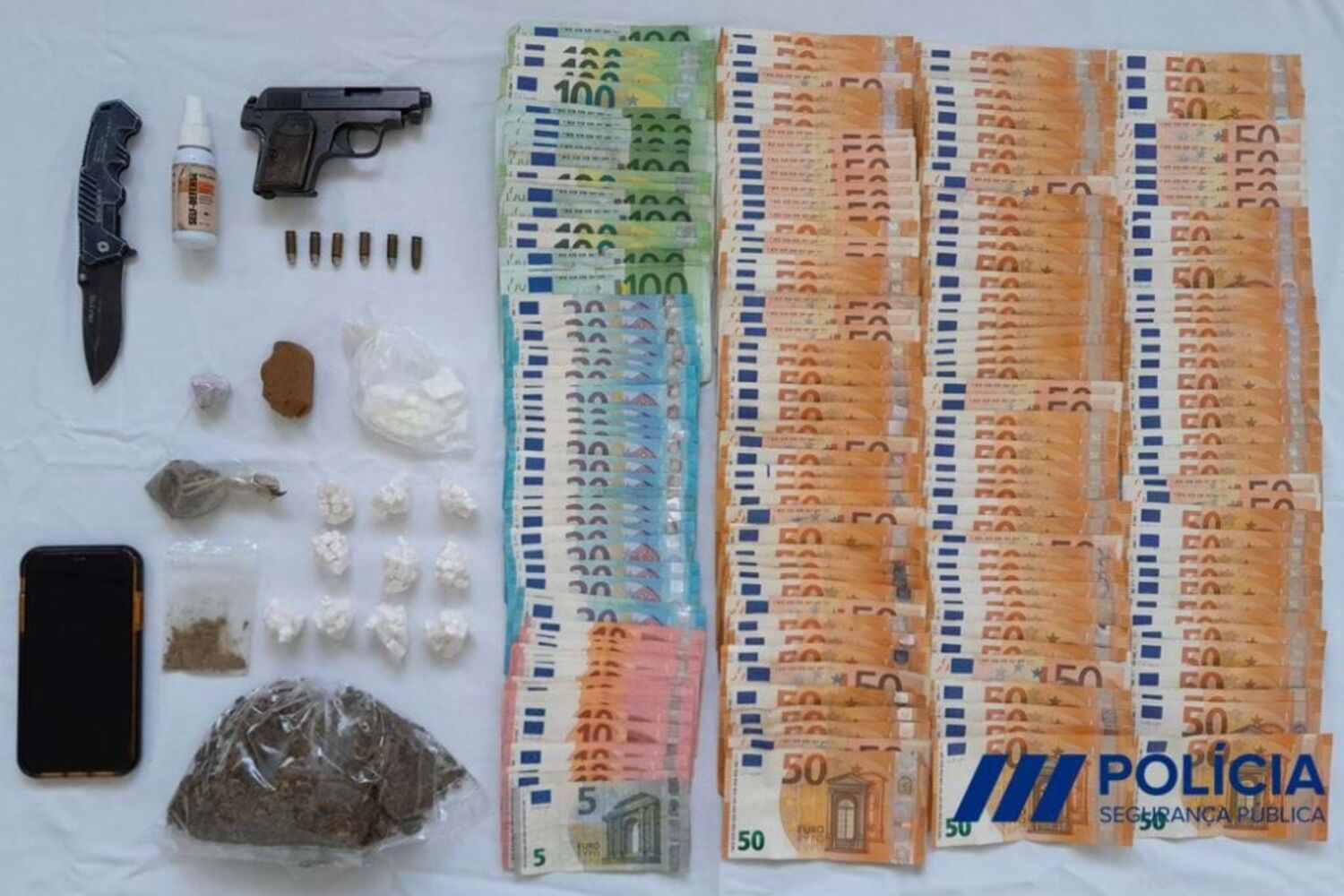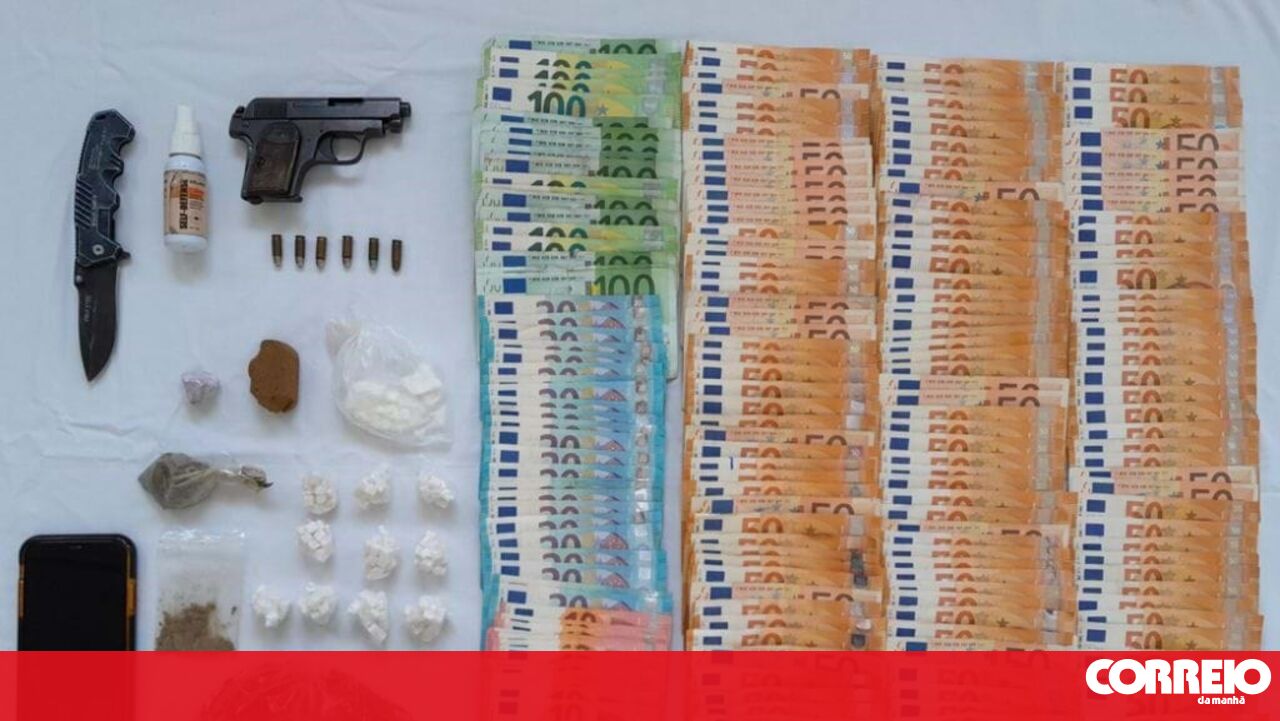 No decurso das diligências, a PSP apreendeu 518 doses de estupefacientes, cerca de dez mil euros em notas, e ainda uma pistola de calibre 6,35 milímetros, com carregador e seis munições do mesmo calibre, um aerossol de defesa (gás), uma faca de abertura automática e um telemóvel.