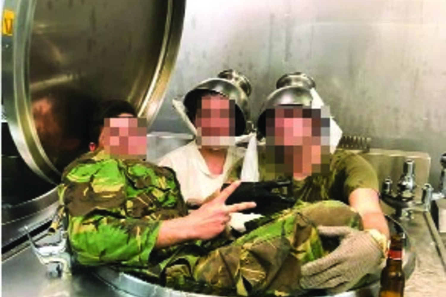 Fotos e vídeos mostram vários militares –e não apenas dois –a divertirem-se no local onde é confecionada a comida.