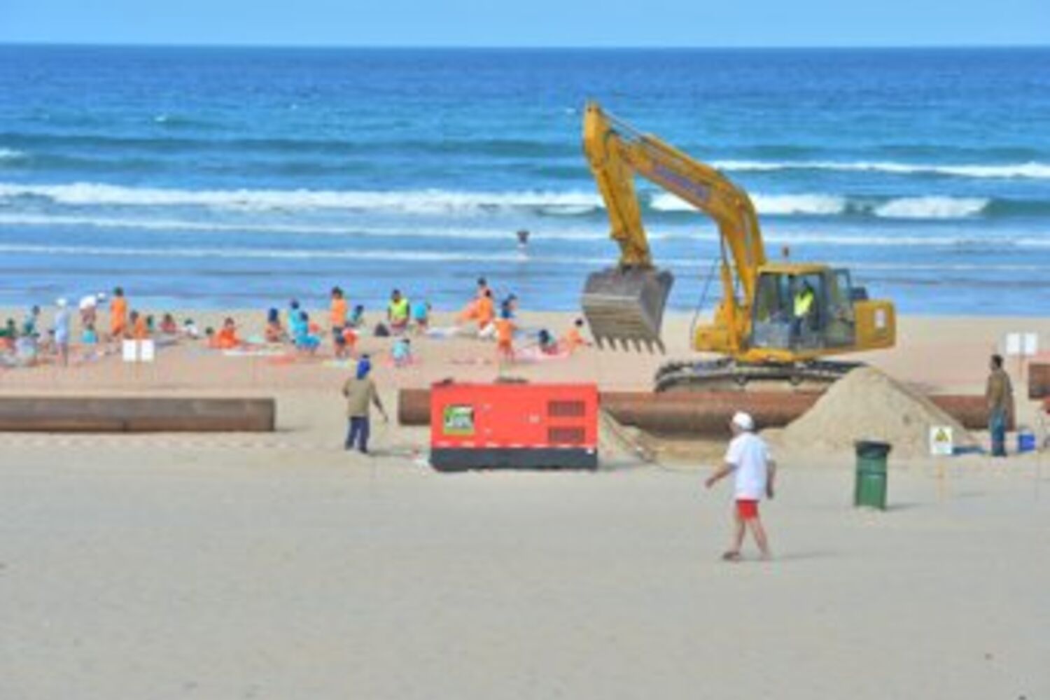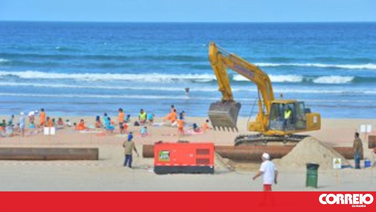 Retroescavadoras, secções a serem soldadas para formar um tubo de 700 metros, trabalhadores da construção civil em plena azáfama - era este o cenário com que se confrontavam ontem banhistas e colónias de férias na praia da Saúde, Costa da Caparica. Os trabalhos para reposição de areia nas praias após as intempéries do inverno começaram a 27 de junho e, segundo o Ministério do Ambiente, só terminam a 26 de agosto.