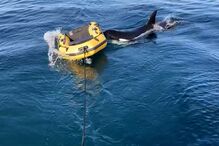 Embarcação sofreu danos após interação com mamíferos. Dois tripulantes foram auxiliados.