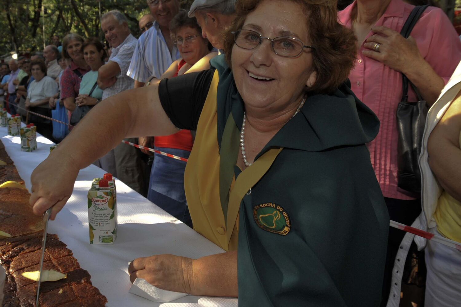 Um bolo de pêra-rocha com 60 metros de comprimento e 500 quilos de peso foi servido ontem à tarde, no Bombarral, às milhares de pessoas que, num tributo à ‘rainha da fruticultura’, aderiram às iniciativas do último dia da XVI Feira Nacional da Pêra-Rocha.