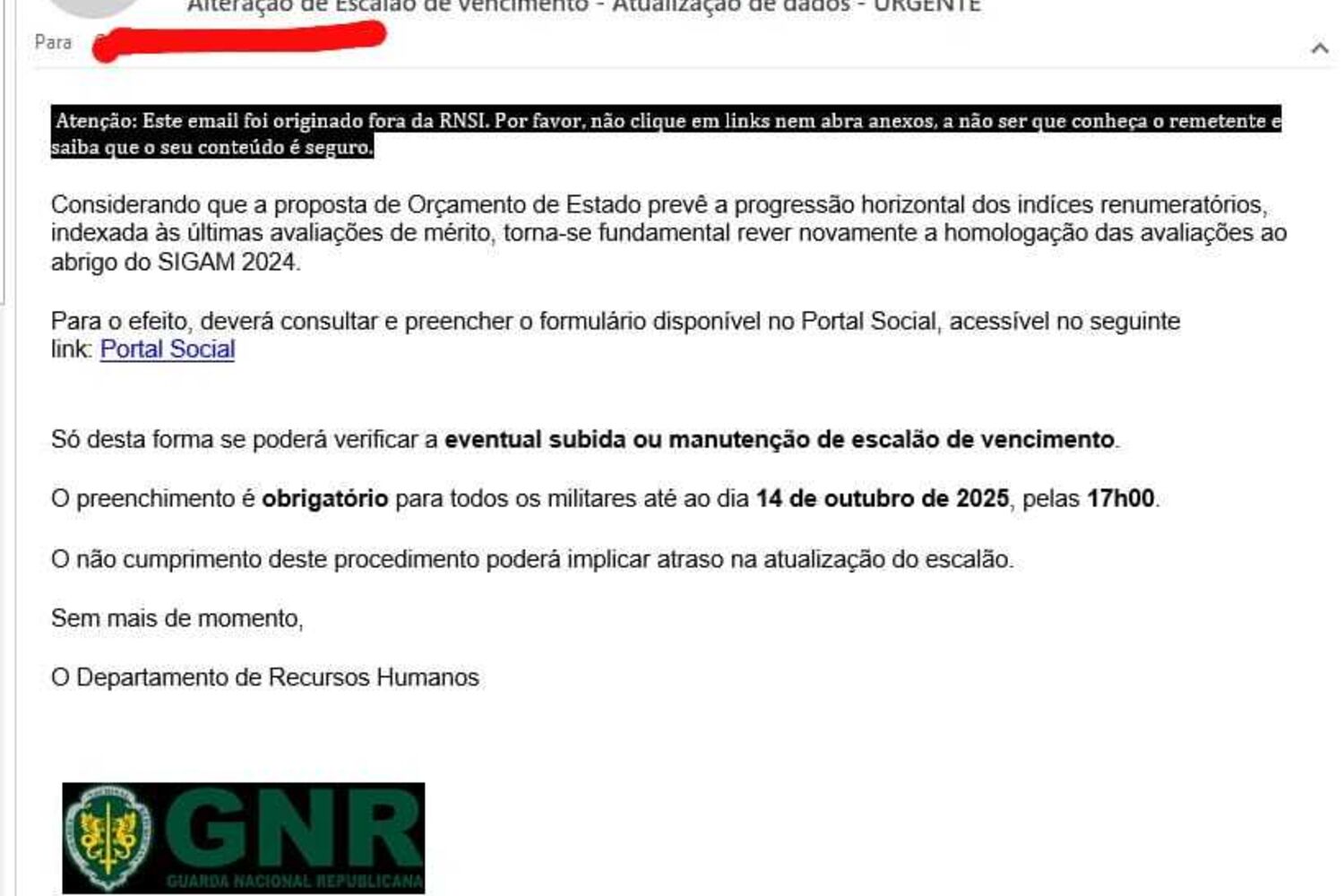 Ao CM, fontes da Guarda adiantaram que se tratava de uma fraude informática que usava o endereço eletrónico e a imagem do Departamento de Recursos Humanos da GNR.