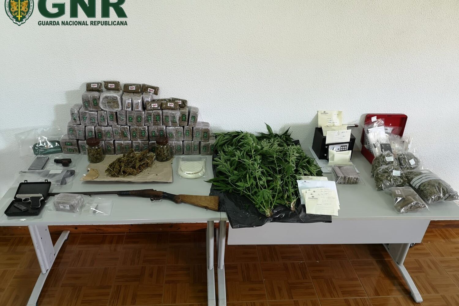 Segundo divulgou GNR, no âmbito desta operação foram apreendidos 30 quilos de haxixe, 287 doses de canábis, 46 doses de cocaína, dois pés de canábis, três viaturas, quatro armas de fogo, sete armas brancas, 118 munições, cinco balanças de precisão, 18 telemóveis e 2.110 euros em numerário.