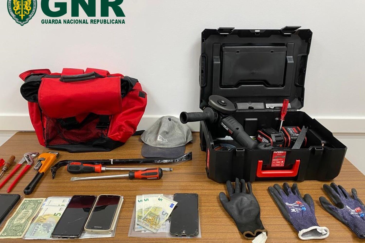 Os militares da Guarda rapidamente montaram uma perseguição aos três homens que acabaram por ser detidos na A11. Na sequência de uma busca domiciliária, vários materiais foram apreendidos, nomeadamente seis telemóveis, três relógios, uma máquina fotográfica, três objetivas, um passaporte e 1 540 euros em numerário. Material usado para arealização de assaltos foi também confiscado, entre eles uma rebarbadora.