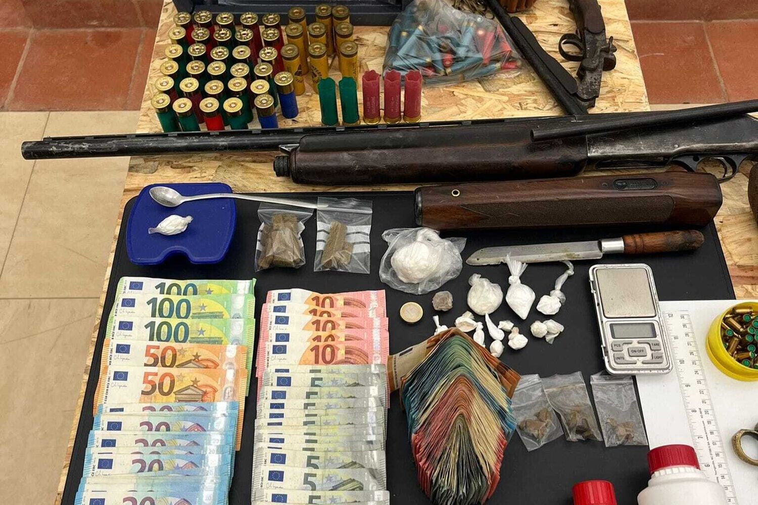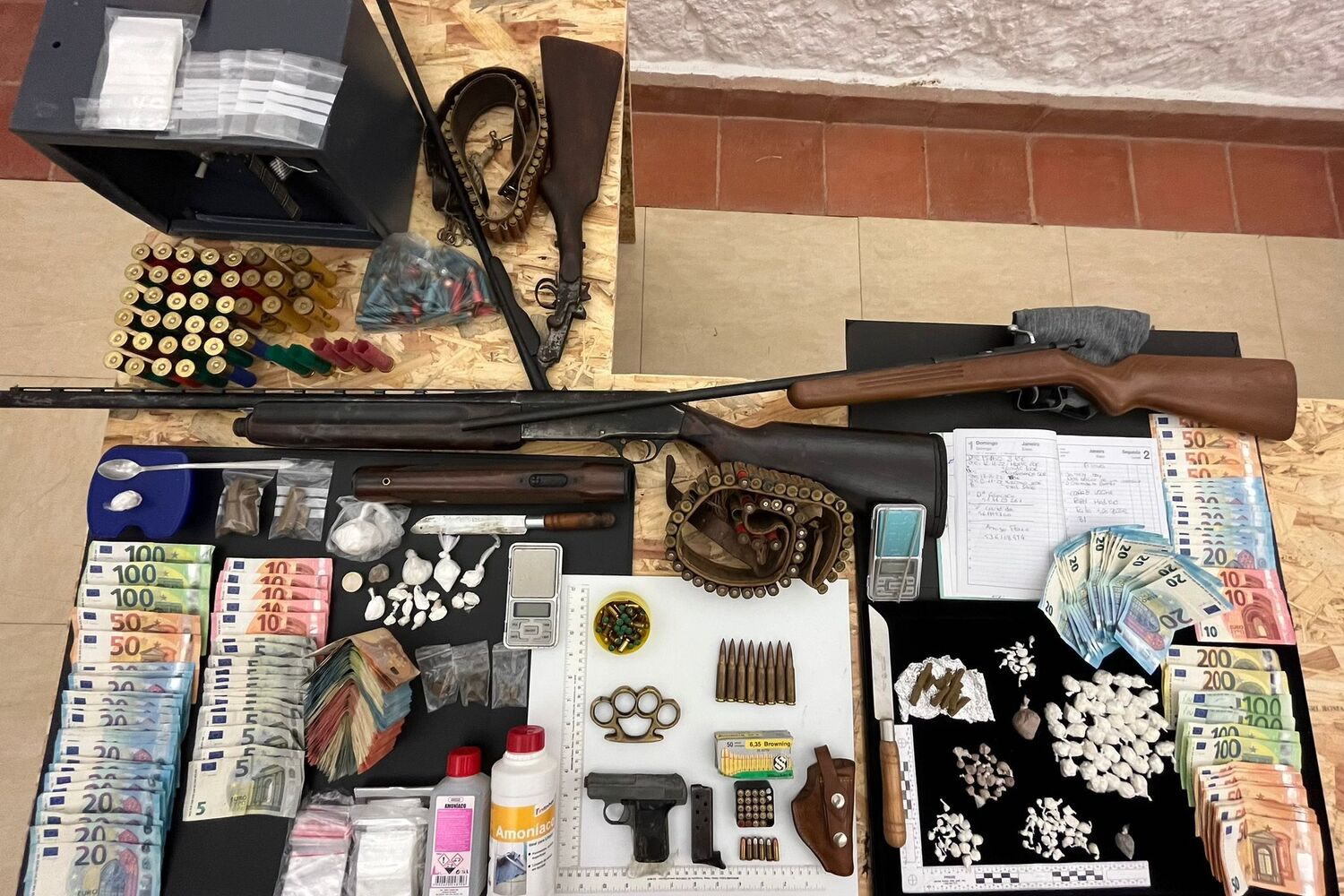 A PSP apreendeu 650 doses de Cocaína, 112 de haxixe, 140 de Heroína, 5200 euros, 3 caçadeiras, 1 pistola, dezenas de munições de vários calibres, uma soqueira, 2 cofres, e variado material associado ao tráfico de droga.