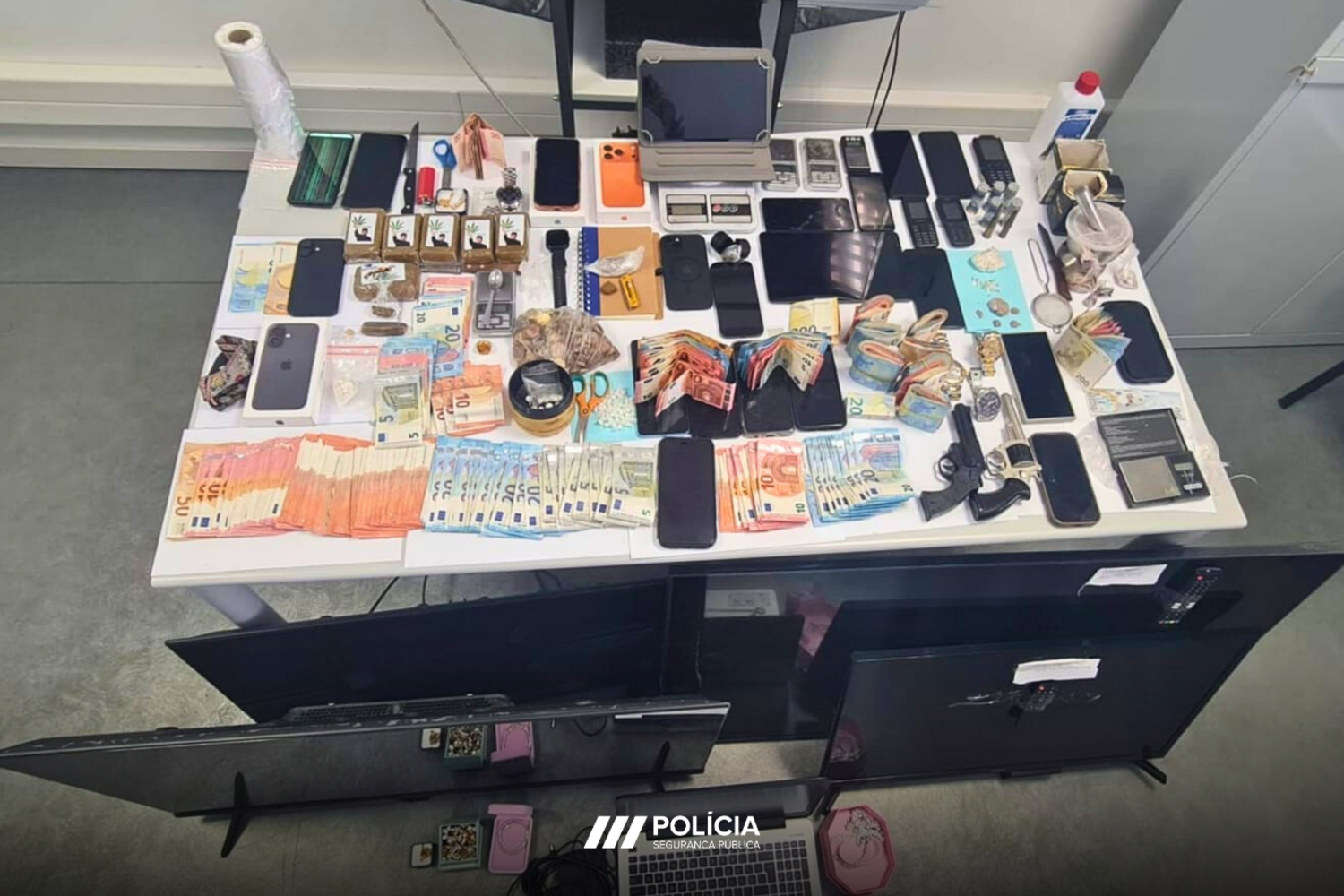 Foi apreendido diverso equipamento eletrónico, "utilizado para suportar a atividade ilícita ou adquiridos com lucros resultantes da atividade criminosa (telemóveis e computadores)"; 29.301 euros "resultantes dos proveitos da atividade ilícita"; diverso material, que era utilizado para preparar, pesar, embalar e transportar o estupefaciente traficado; várias peças de metais preciosos, "por terem sido adquiridas com os proveitos dos lucros do tráfico"; uma arma de brinquedo com a aparência de uma arma de fogo real; uma arma de alarme; duas viaturas; 43,6 gramas de produto indeterminado utilizado para misturar com estupefaciente; 3,70 doses de anfetaminas; 1604,02 doses de haxixe; 496,70 doses de cocaína; e 306,80 doses de heroína.