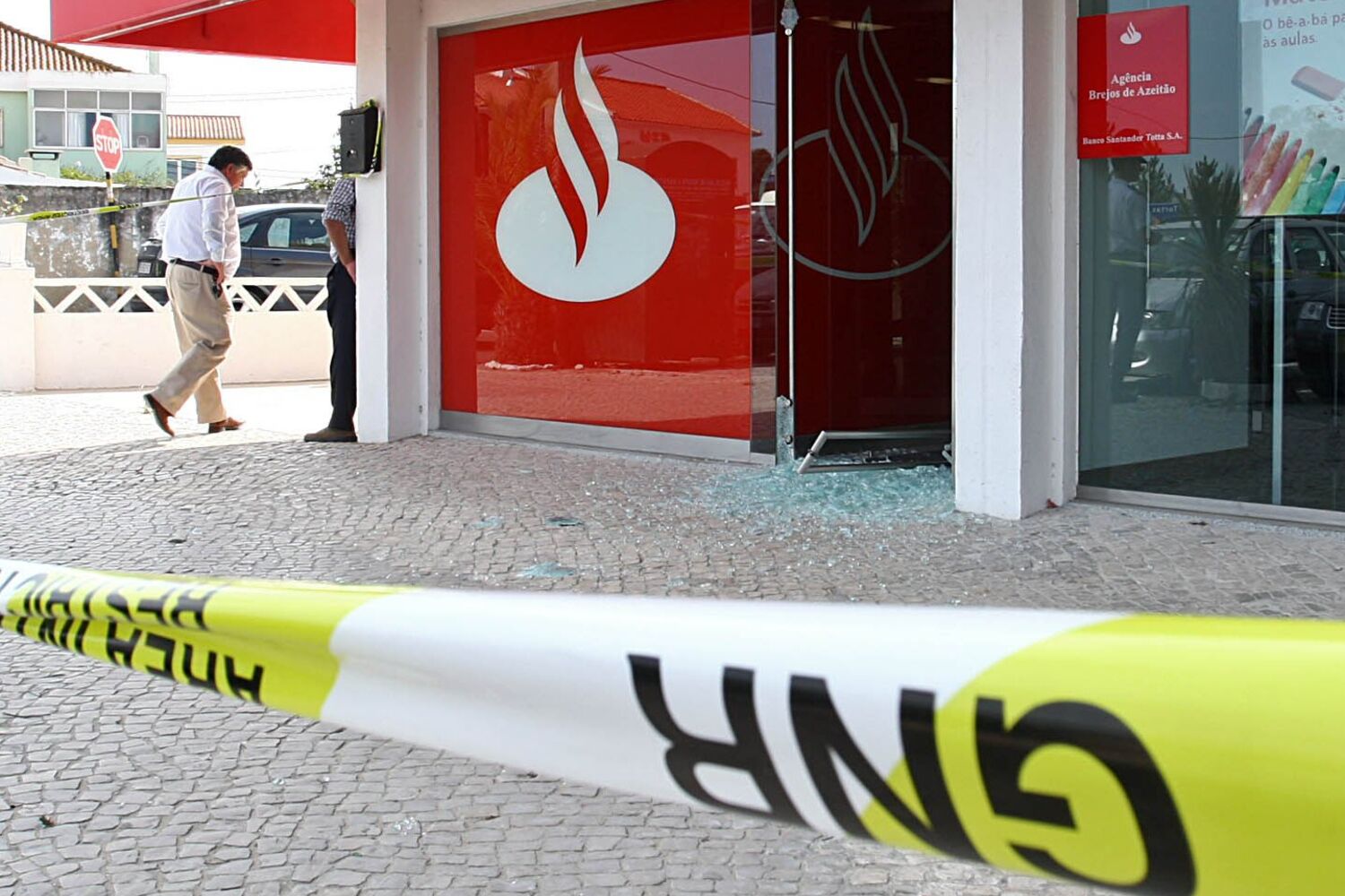 Moradores e comerciantes olharam estupefactos. Três encapuzados, dois deles armados com caçadeira, saíam do Santander Totta de Brejos de Azeitão, Setúbal, com um saco cheio de dinheiro. Os ladrões até deixaram cair algumas notas na fuga. <br/><br/>