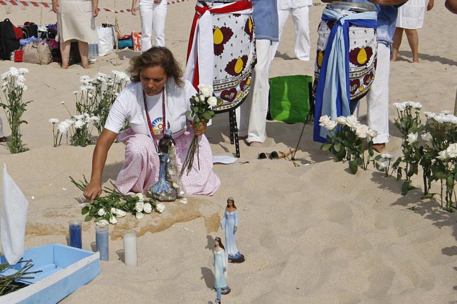 Vestidas de branco, cerca de 50 pessoas ofereceram flores brancas a Yemanjá, a deusa do Mar e da Fecundidade, num ritual realizado ontem em plena luz do dia na praia de Alfarim, em Sesimbra. Uns motivados pela fé em algo superior e outros pela curiosidade, todos participaram num ritual onde o mundo dos espíritos e o mundo terreno se misturaram através de sons e cânticos hipnotizantes.