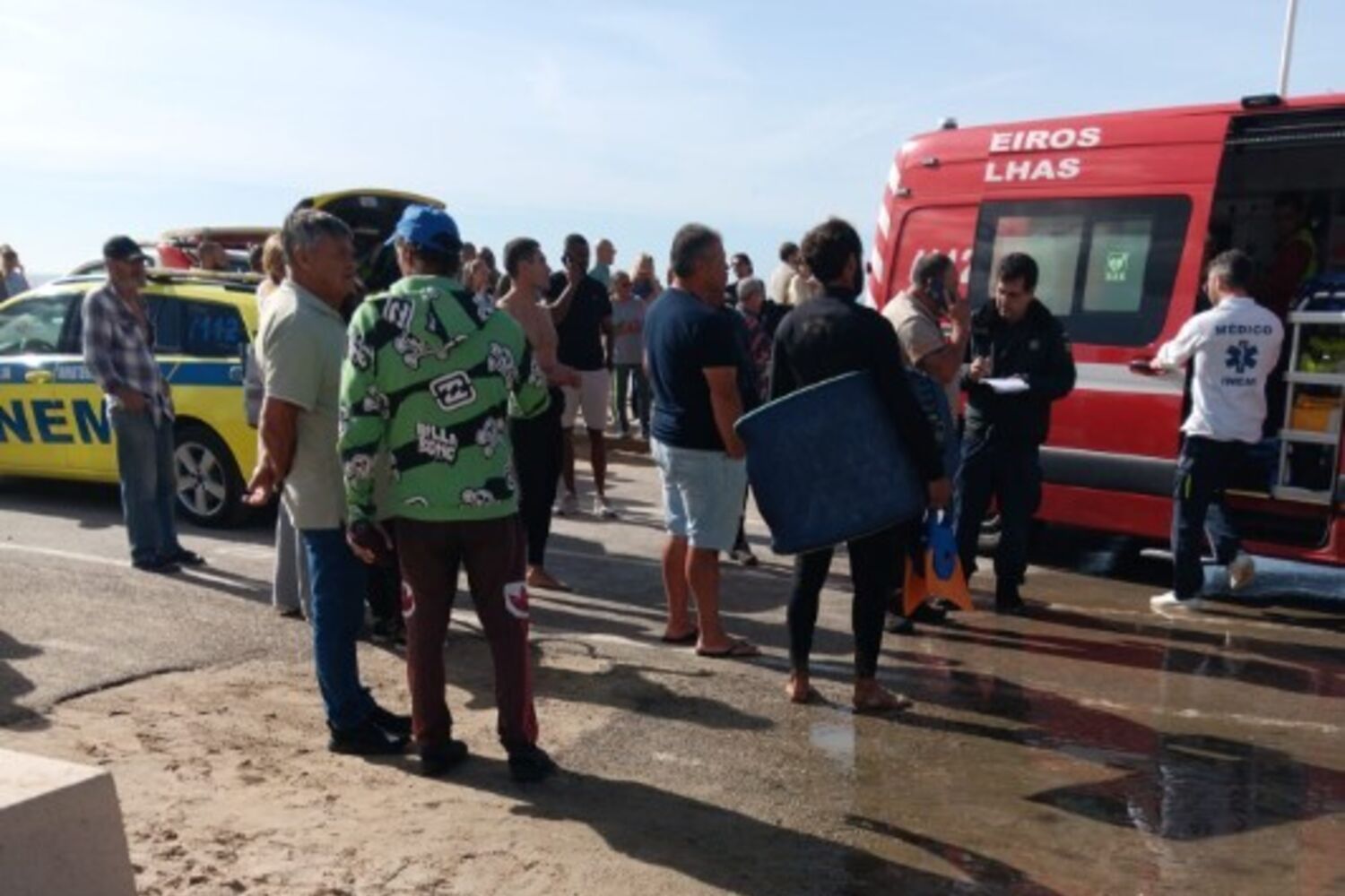 Homem assistido no areal da Praia Nova por nadadores-salvadores, INEM e Polícia Marítima.