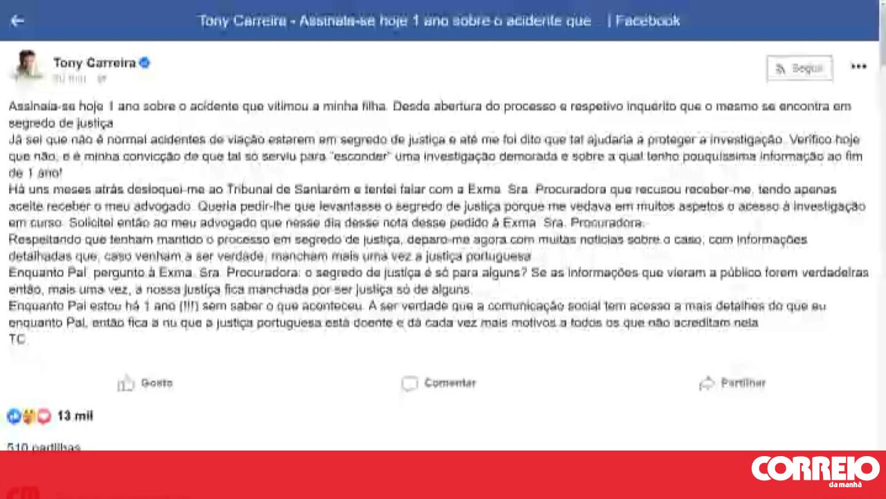 No texto partilhado no Facebook, Tony Carreira deixa duras críticas à justiça: "Há uns meses atrás desloquei-me ao Tribunal de Santarém e tentei falar com a Exma. Sra. Procuradora que recusou receber-me, tendo apenas aceite receber o meu advogado. Queria pedir-lhe que levantasse o segredo de justiça porque me vedava em muitos aspetos o acesso à investigação em curso".