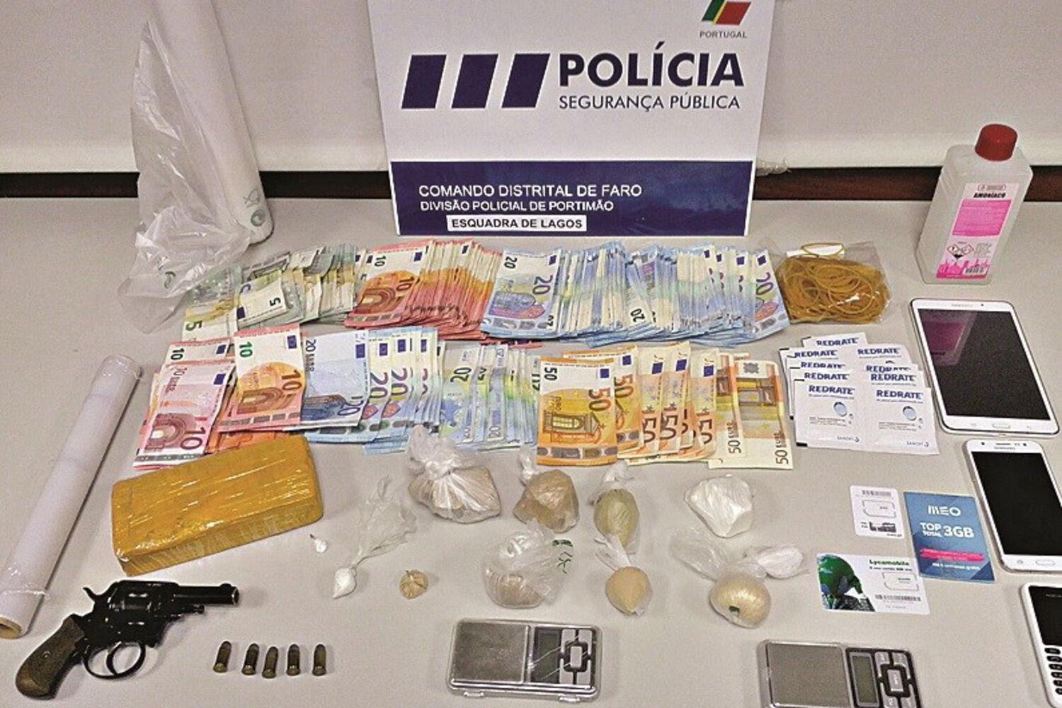 "Na sequência das diligências de investigação foram-lhe apreendidas 522 doses de cocaína, 8490 doses de heroína, 31,52 gramas de produto utilizado no corte do estupefaciente, balanças de precisão, uma arma de fogo, cerca de 6150 euros em dinheiro, telemóveis, entre vários outros objetos relacionados com a atividade ilícita que de-senvolvia", revelou ontem o Comando de Polícia de Faro.