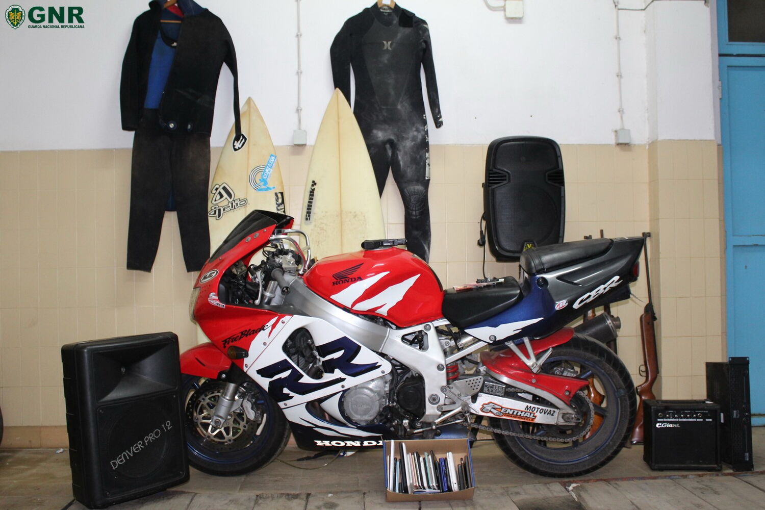 Na sequência da detenção foi realizada uma busca domiciliária onde foi possível apreender quatro armas de pressão de ar, uma arma de Airsoft, réplica de uma pistola Glock 19 e um motociclo de alta cilnidrada.