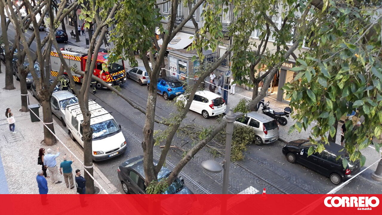 Um tronco de uma árvore partiu e caiu esta quinta-feira na Rua Ferreira Borges, em Lisboa.