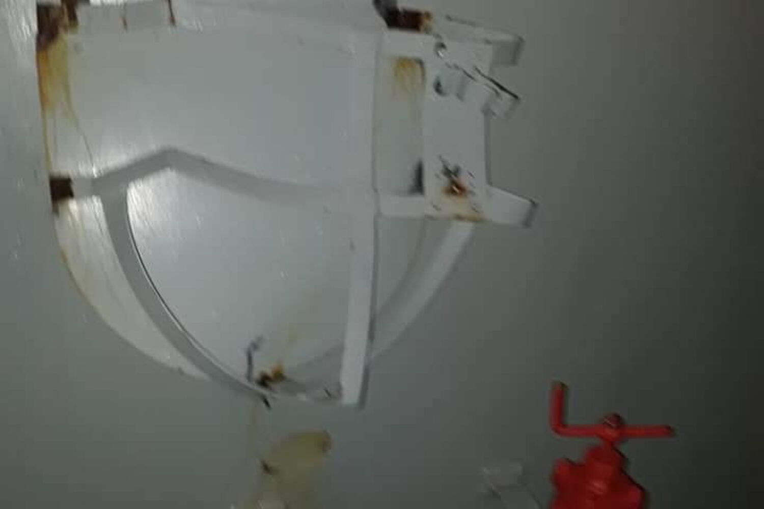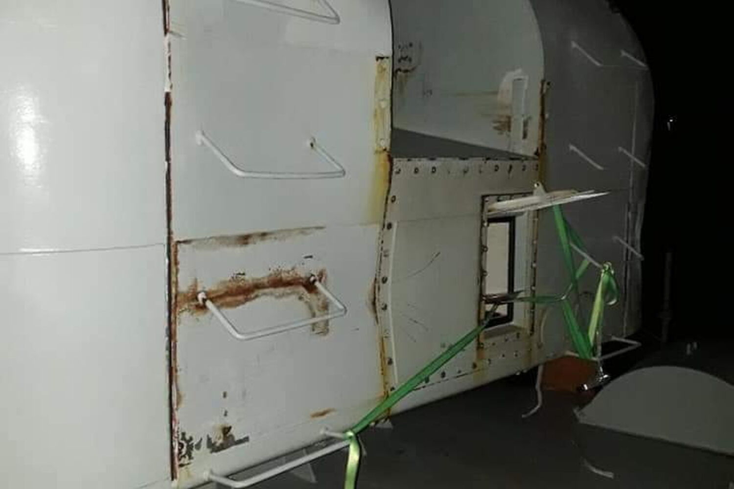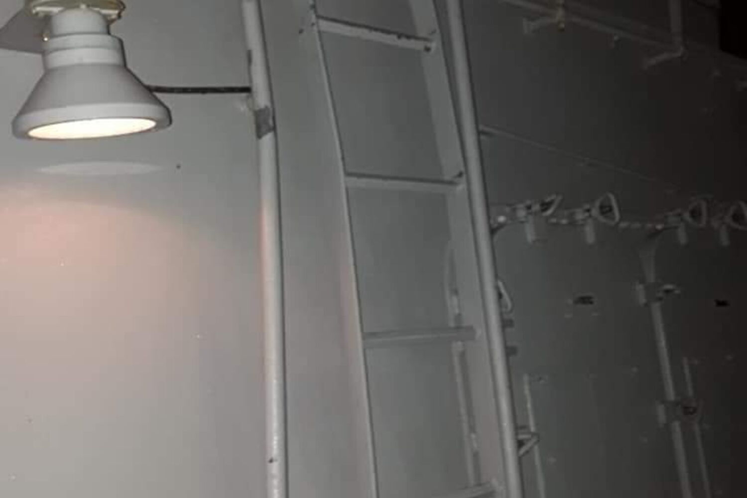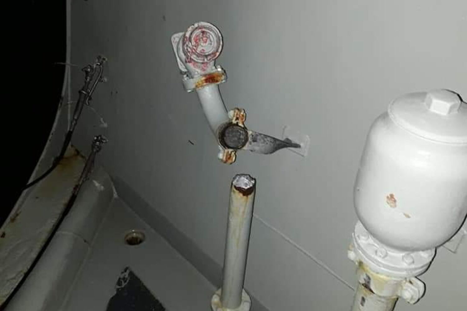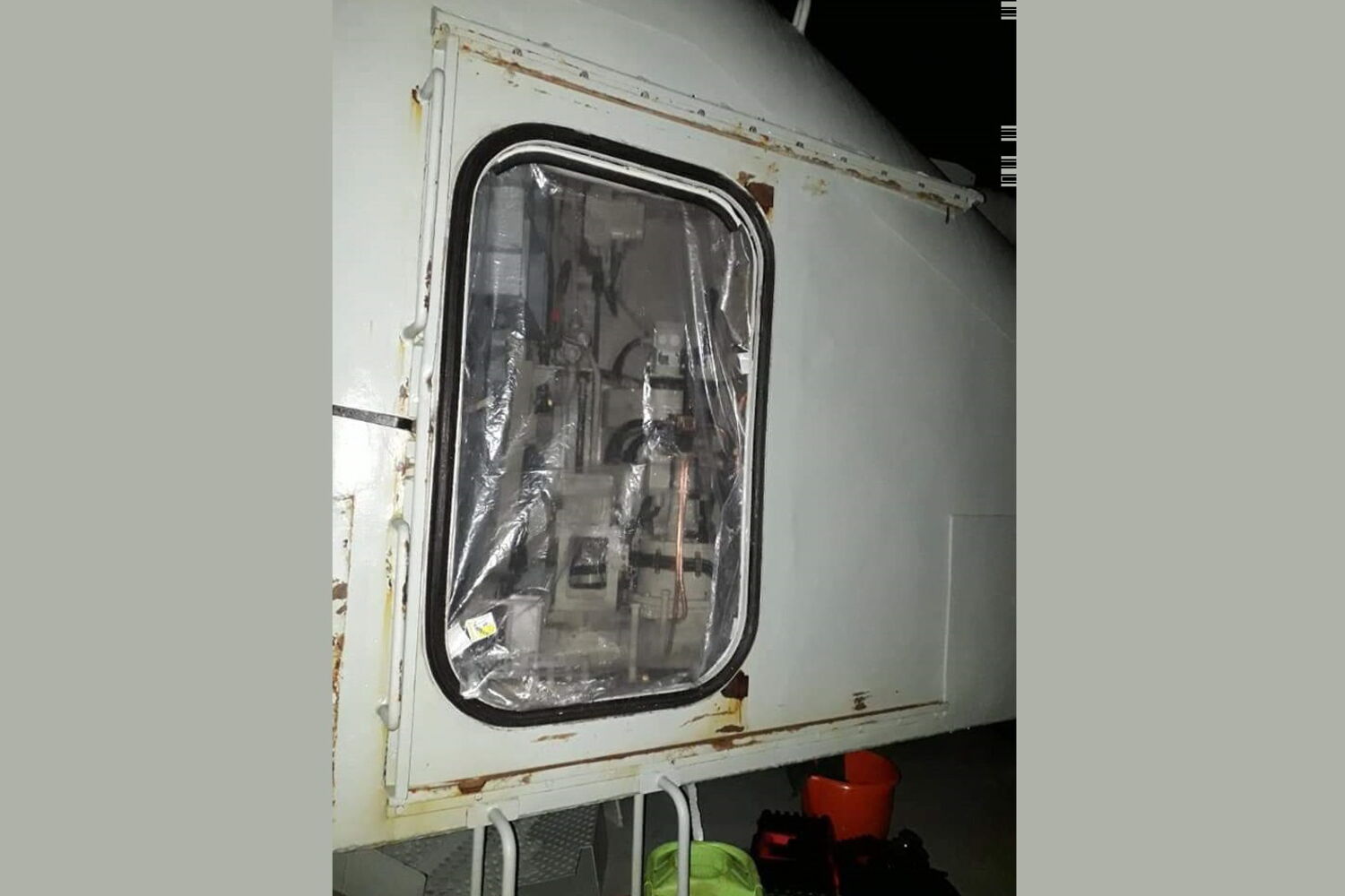 São danos em estruturas de ferro do navio e na peça de artilharia de 100 mm à proa (frente do navio), causados pelo forte mar apanhado no golfo da Biscaia (entre a costa norte da Espanha e a costa sudoeste da França).