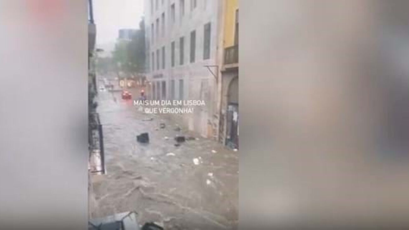 A rua das Pretas em Lisboa voltou a inundar devido ao mau tempo. Vários caixotes foram arrastados pela força da água, que dificultou a circulação dos carros.