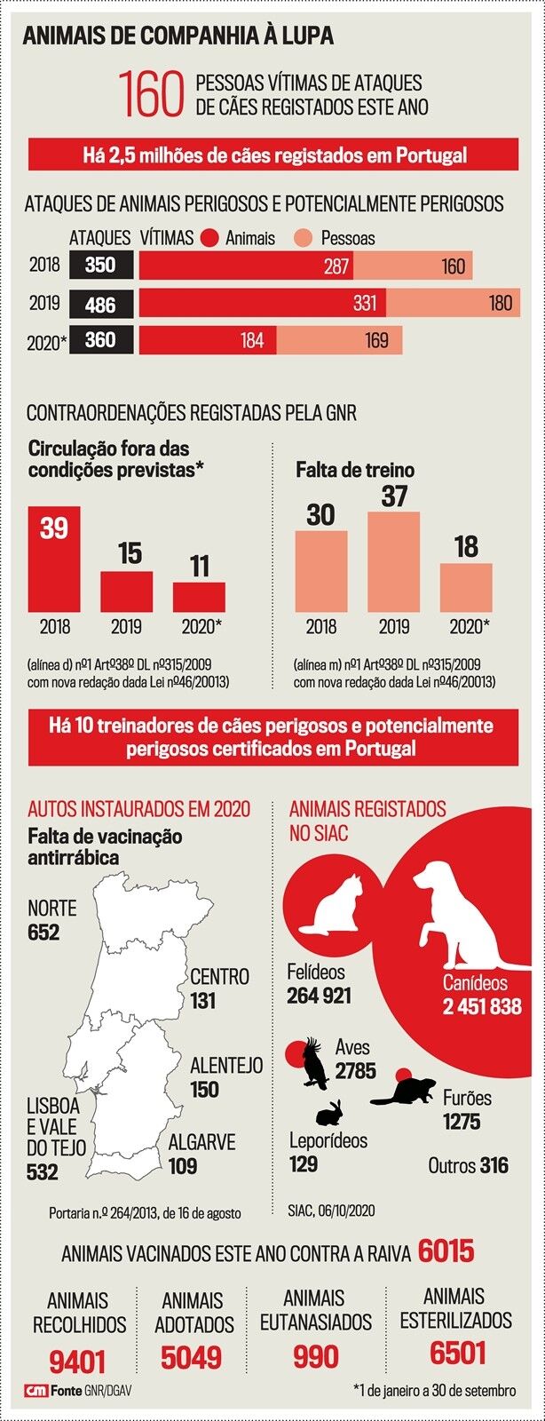 Segundo os dados da GNR disponibilizados ao CM, em 2018 ocorreram 360 ataques de cães, os quais vitimaram 169 pessoas e 184 outros animais. Em 2019 houve uma subida para 486 ataques, que visaram 180 pessoas e 331 animais. Por sua vez, nos primeiros nove meses deste ano, os militares da GNR registaram 350 ataques que atingiram 160 pessoas e 287 animais.A lei obriga que os cães considerados de raças perigosas sejam sujeitos a treino por profissionais habilitados. Contudo, encontram-se certificados e com titulo profissional emitido pela Direção-Geral de Alimentação e Veterinária apenas 10 treinadores de cães perigosos e potencialmente perigosos. Um número “aquém das necessidades”, considerou o bastonário da Ordem dos Veterinários, Jorge Cid. “Há pessoas que desconhecem essa obrigatoriedade. É natural que com o passar do tempo mais pessoas ganhem essas competências para darem formação”, acrescentou.A GNR verifica uma tendência de queda nas contraordenações registadas sobre cães potencialmente perigosos: 69 multas aplicadas em 2018, 52 em 2019 e este ano, até 30 de junho, um total de 29. A maior parte resulta da falta de documentos comprovativos de que o animal foi treinado, num total de 18 neste ano. Em igual período, há também o registo de 11 contraordenações pela circulação sem trela.Maior gravidade atinge os autos passados por falta de vacinação antirrábica no território continental. Só no primeiro semestre deste ano são já 1574. O Norte lidera com 652 contraordenações, Lisboa e Vale do Tejo regista 532, Alentejo 150, Centro 131 e o Algarve 109.