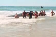 Banhistas unem esforços para tentar salvar baleia de 10 metros na praia da Fonte da Telha em Almada