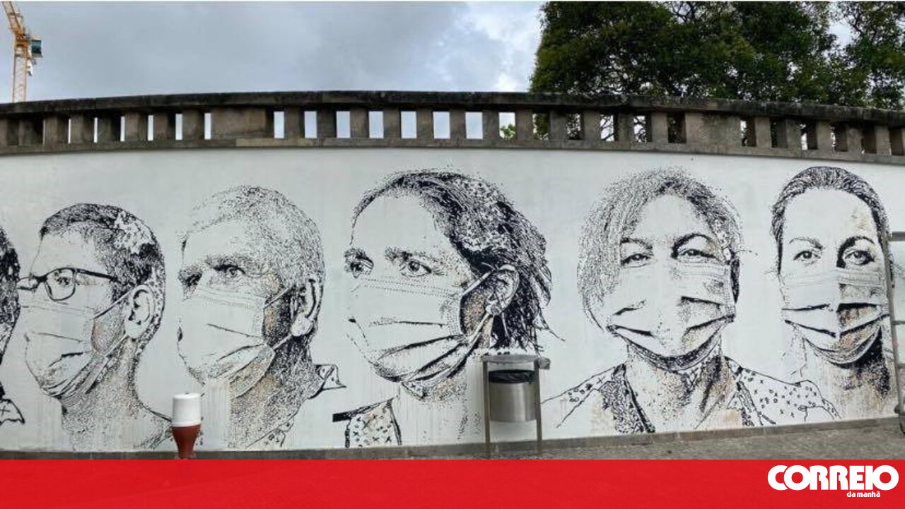 O artista Vhils criou um mural dedicado aos profissionais de saúde no hospital de São João, no Porto. No mural, no exterior do edifício, vêem-se várias pessoas de máscara na cara.