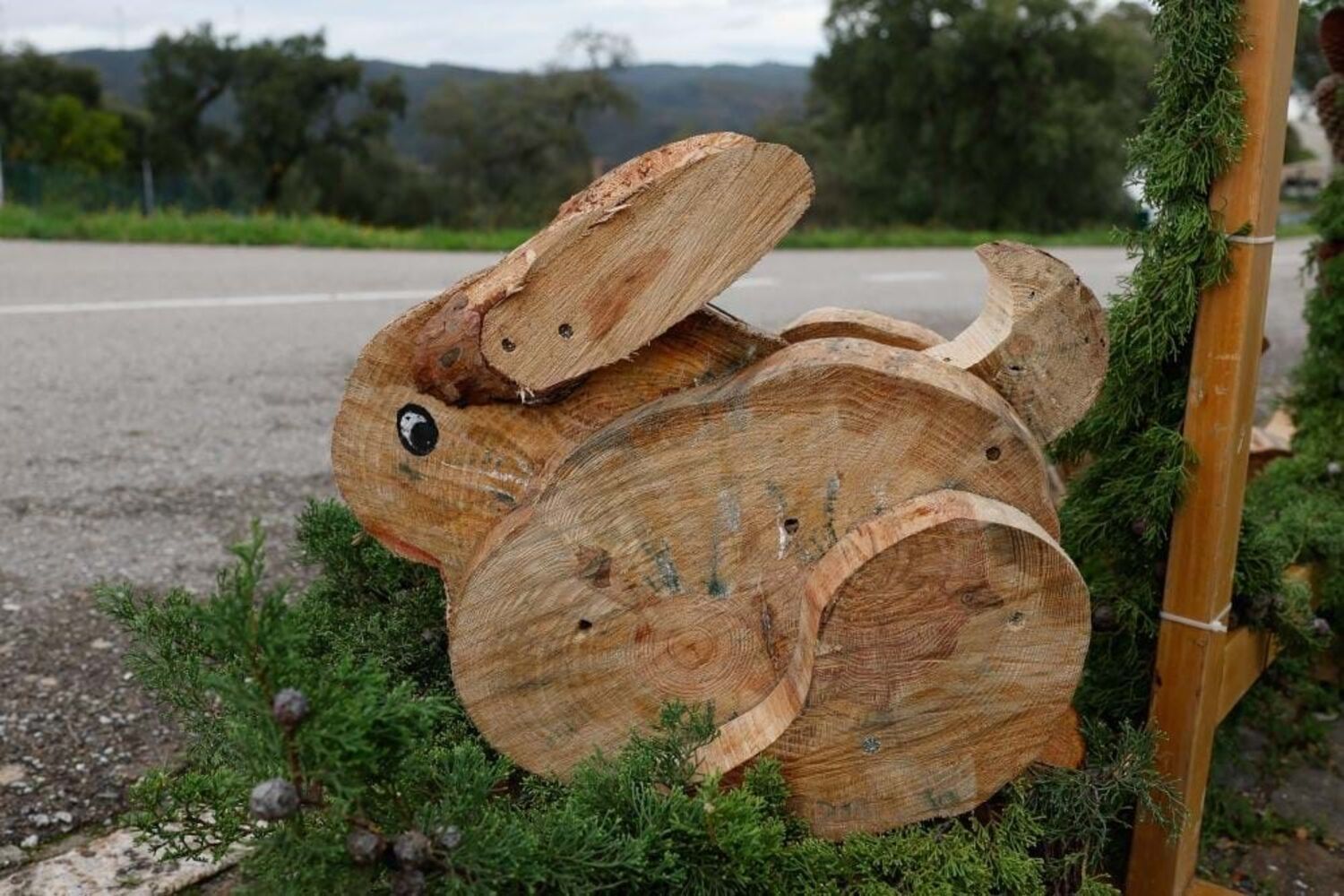 "Aqui nada é adquirido. É tudo o que a natureza dá. A natureza tem um potencial enorme", explicou Sónia Martins sobre as cascas, pinheiros, pinhas e folhas que foram utilizados em adereços decorativos e as árvores que já estavam a precisar de ser abatidas, agora esculpidas em forma de animais, como galos, coelhos, porcos, mochos ou veados.