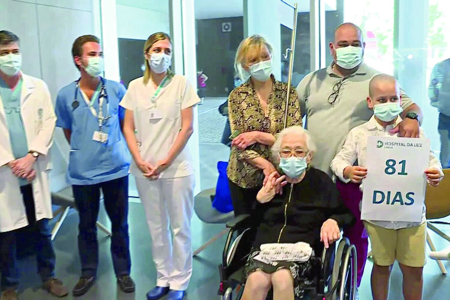 A filha, o neto e o bisneto foram buscá-la, depois de quase três meses sem se verem. Pedro Nunes, de apenas nove anos, é bisneto de Odete. A idade não lhe tira a realidade. "Eu sempre tive esperança apesar de a doença ser muito má. Agora só quero levar a avó para casa para lhe dar beijinhos e miminhos", diz. Já a filha confessa ter sido mais pessimista: pensou que "a mãe ia morrer". "Não estar com a minha mãe este tempo todo e não poder fazer nada foi muito angustiante", acrescenta.
