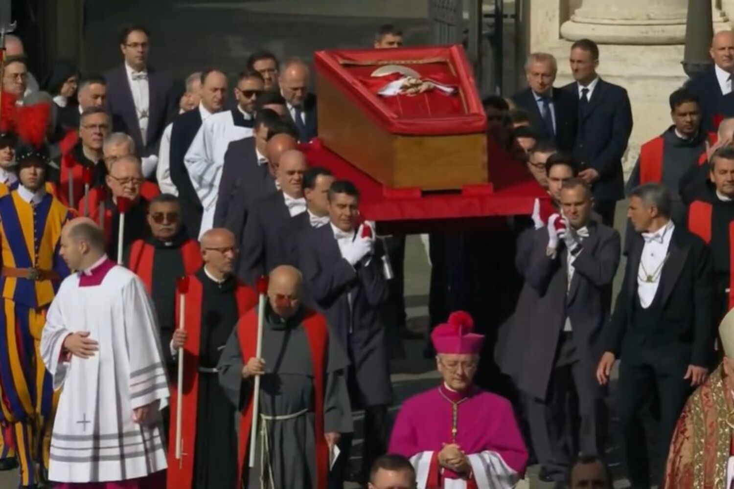 O caixão de Francisco está ladeado por quatro guardas suíços em posição de sentido. Do lado de fora, os padres que estão a transportar longas velas esperam para liderar a procissão, com os guardas suíços ao seu lado, até à basílica.
