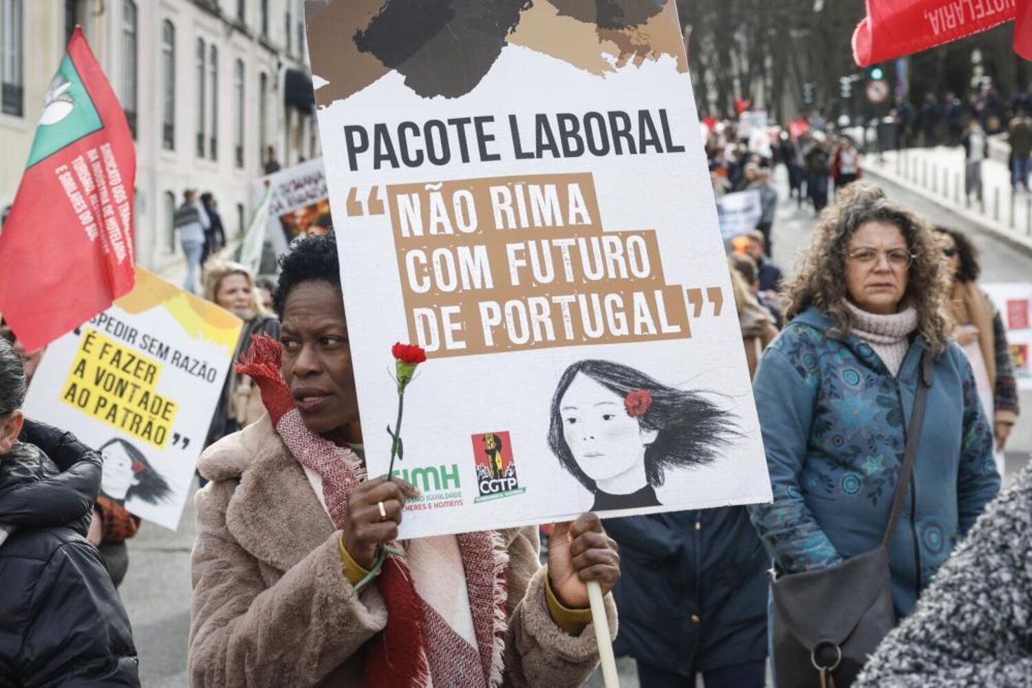 "Igualdade salarial é urgente em Portugal", foi um dos 'slogans' escutados ao longo da marcha, em que muitos manifestantes empunhavam cravos vermelhos.
