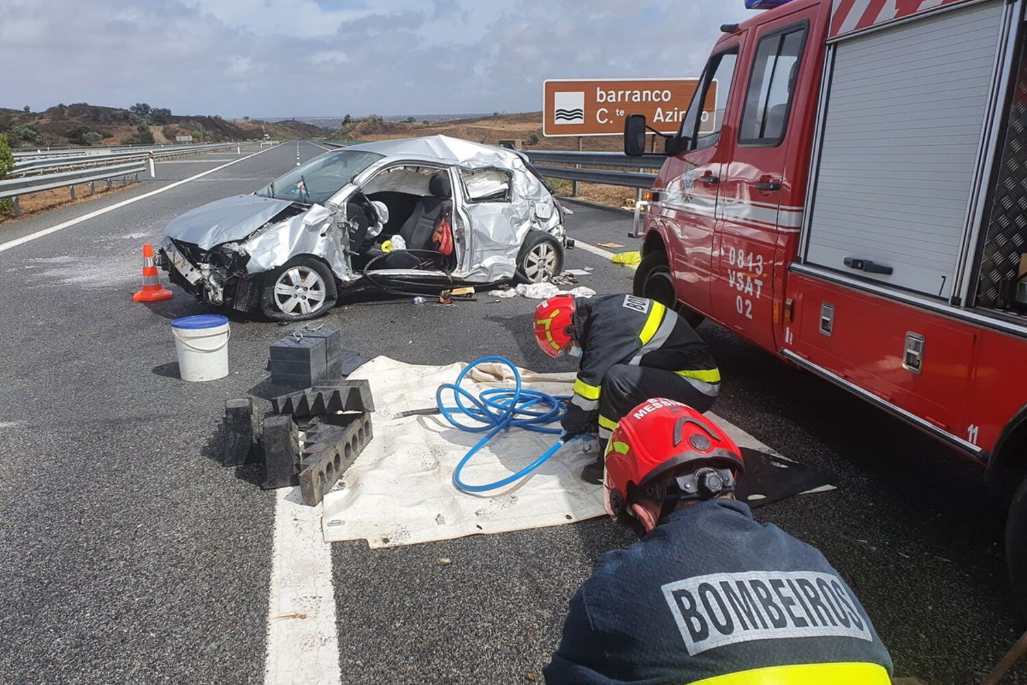 Quando os bombeiros chegaram ao local, quilómetro 201 da A2, o piso estava quase seco, uma vez que tem boa drenagem. Mas a hora do acidente, 11h30, coincide com a passagem de chuvas e ventos fortes pela região do Baixo Alentejo.