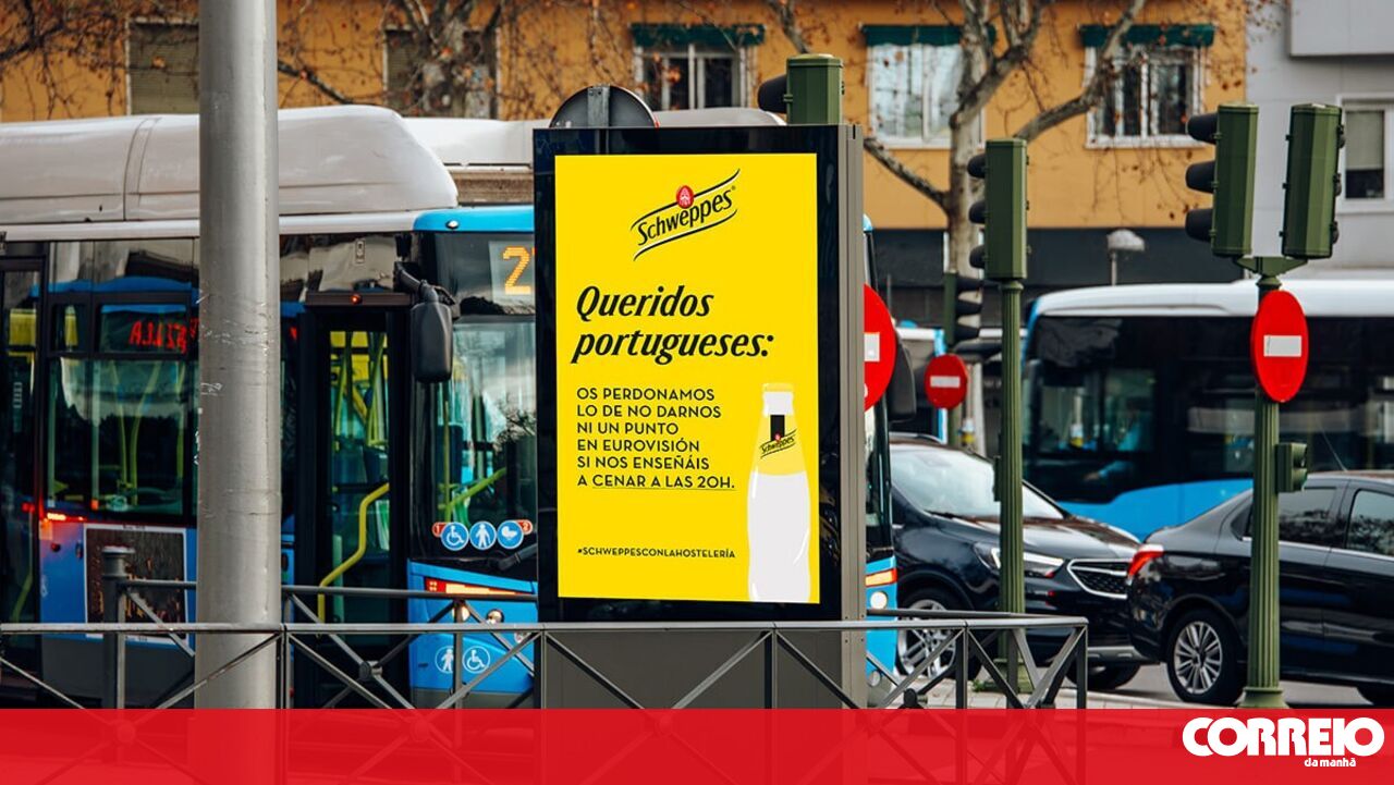 A marca de refrigerantes Schweppes acaba de lançar nas ruas da capital espanhola, Madrid, uma campanha divertida para falar de uma cosia séria: o recolhimento dos espanhóis mais cedo para travar a pandemia de Covid-19. "Queridos portugueses: perdoamos não nos darem nem um ponto [no festival da canção] Eurovisão se nos ensinarem a jantar às 20h00", lê-se nos cartazes.