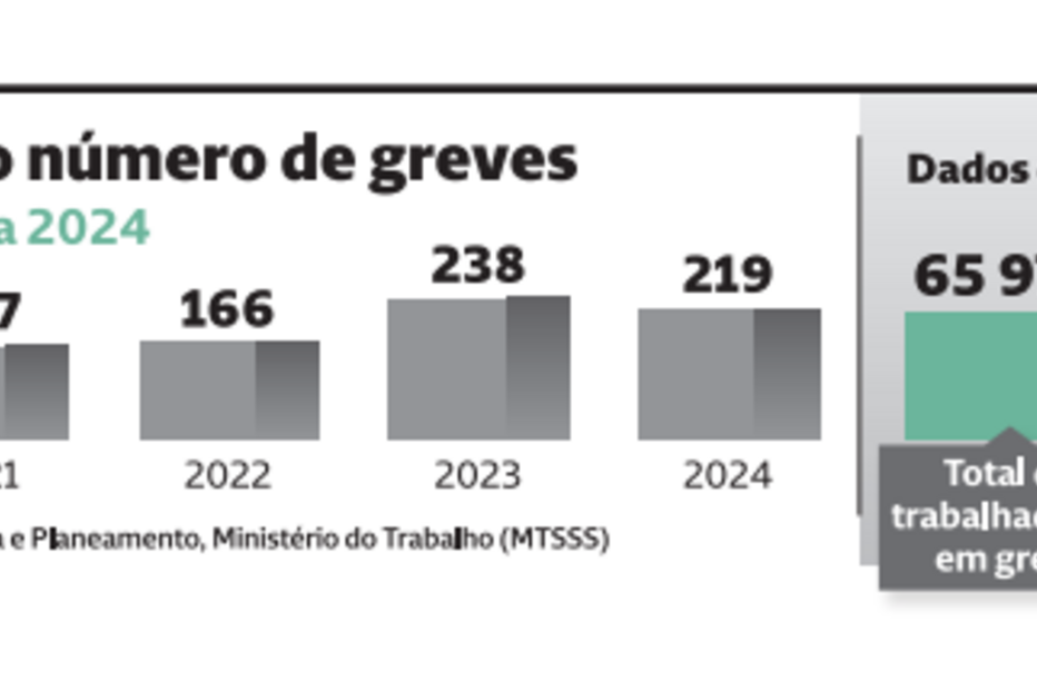 Entre 2020 e 2024, foi em 2023 que ocorreram mais greves (238). No ano passado houve 219 protestos.