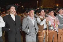 Agora, no palco do centro de convívio da vila, alinhados em três filas e de braços cruzados, João Francisco, Janine e os restantes cantadores do grupo começam por entoar a moda "Fui colher uma romã".
