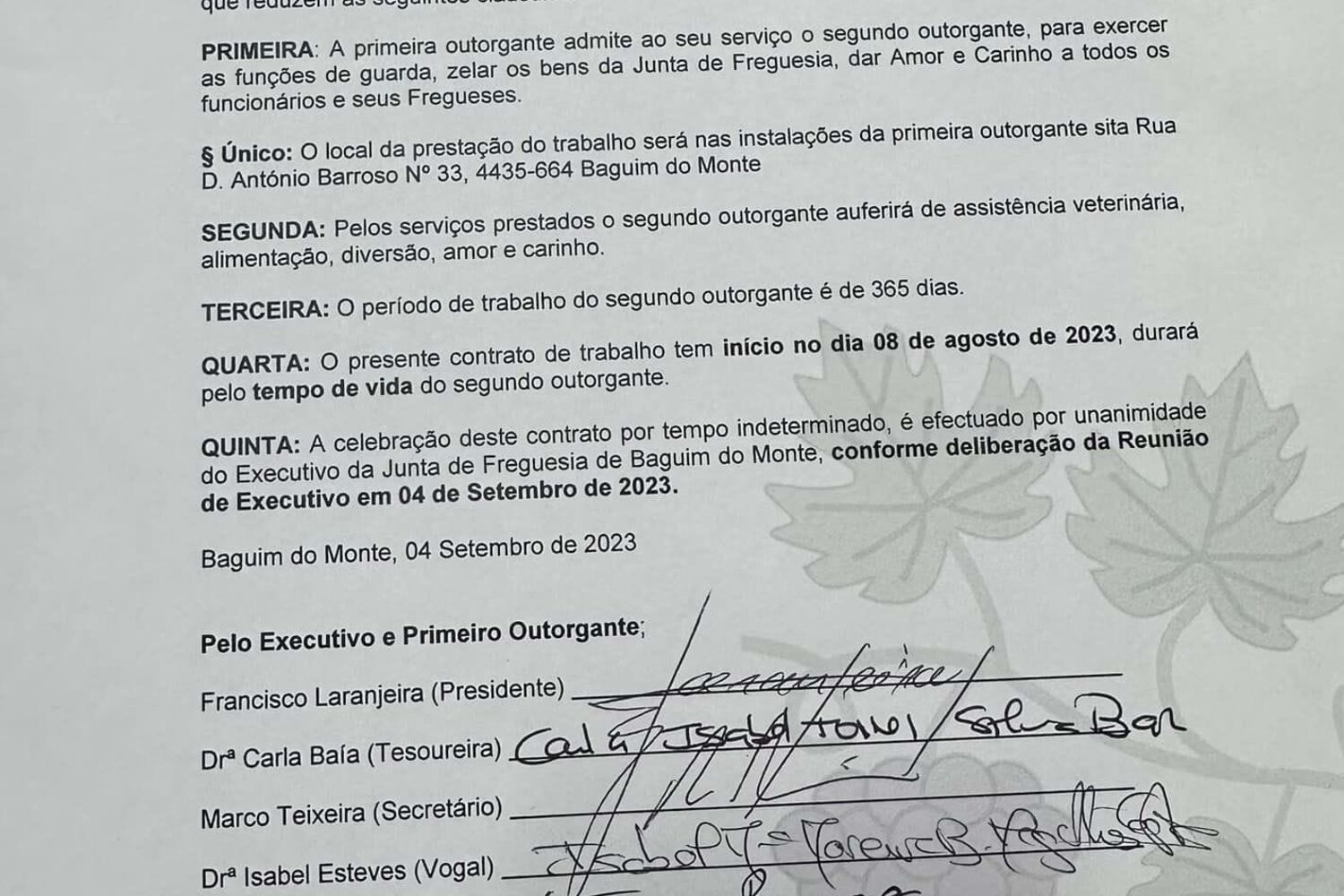 O contrato foi assinado a 4 de setembro, mas com início a 8 de agosto, durando o "tempo de vida do segundo outorgante", lê-se no documento, que determina como funções ao animal "guardar e zelar pelos bens da junta, dar amor e carinho a todos os funcionários e seus fregueses".
