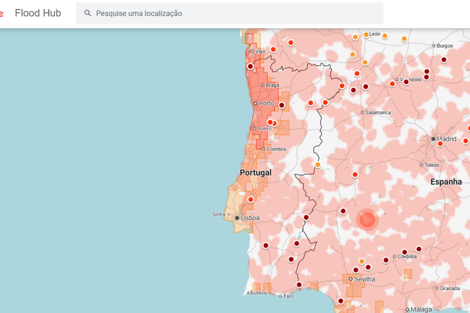 Atualmente o Flood Hub indicava como muito prováveis ou prováveis inundações urbanas repentinas em zonas como Lisboa, Coimbra, Algarve e várias zonas do norte do País.