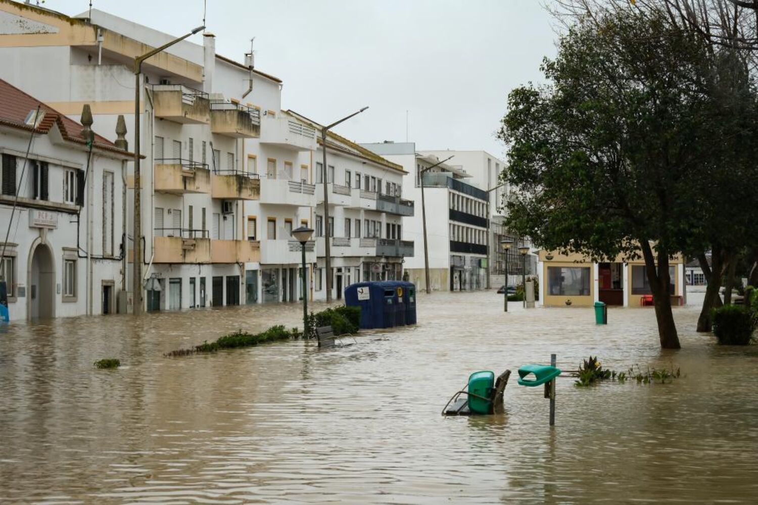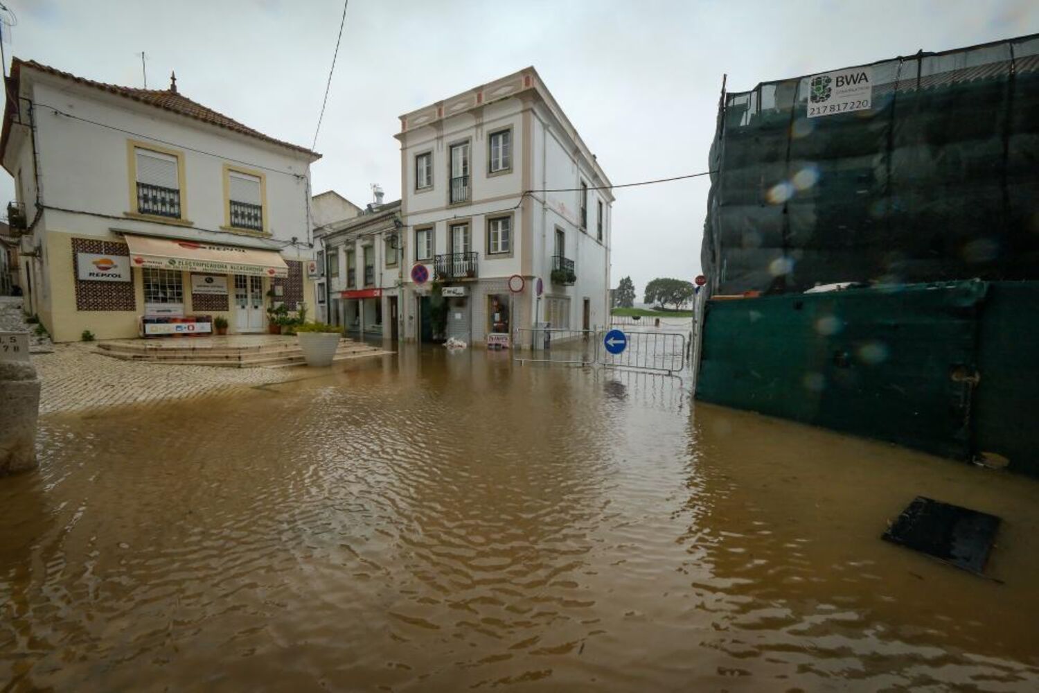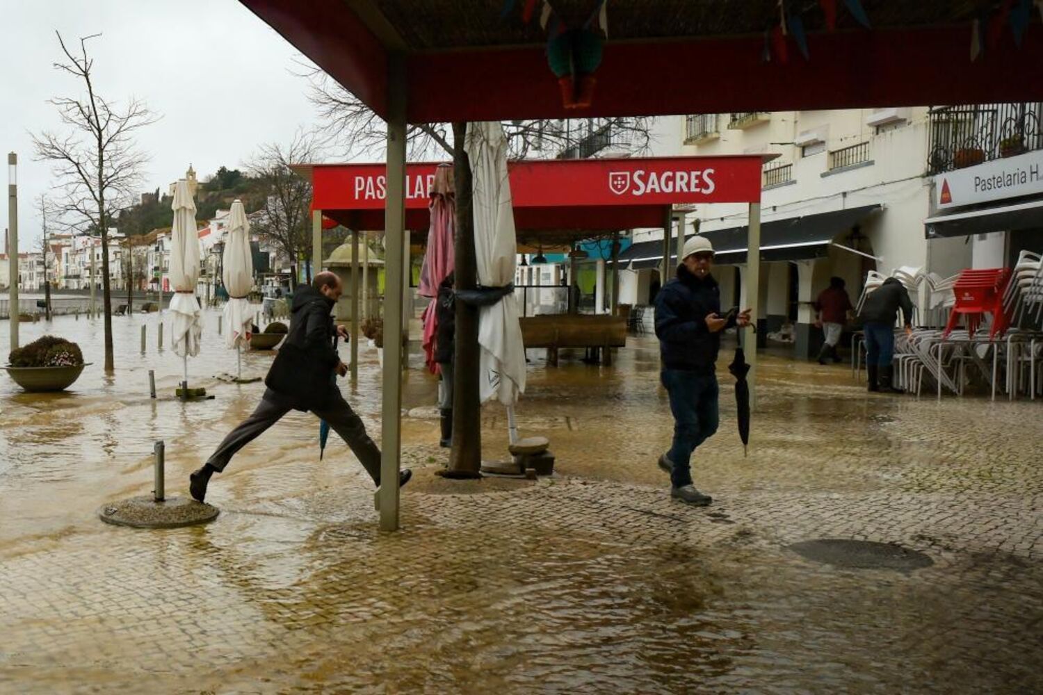 Rio Sado galgou a margem e inundou o Largo Luís de Camões, afetando lojas, restaurantes, cafés e salões de beleza aí localizados.
