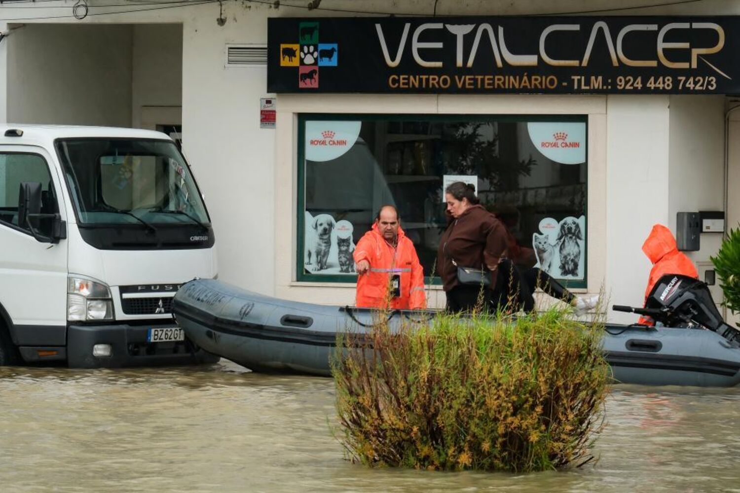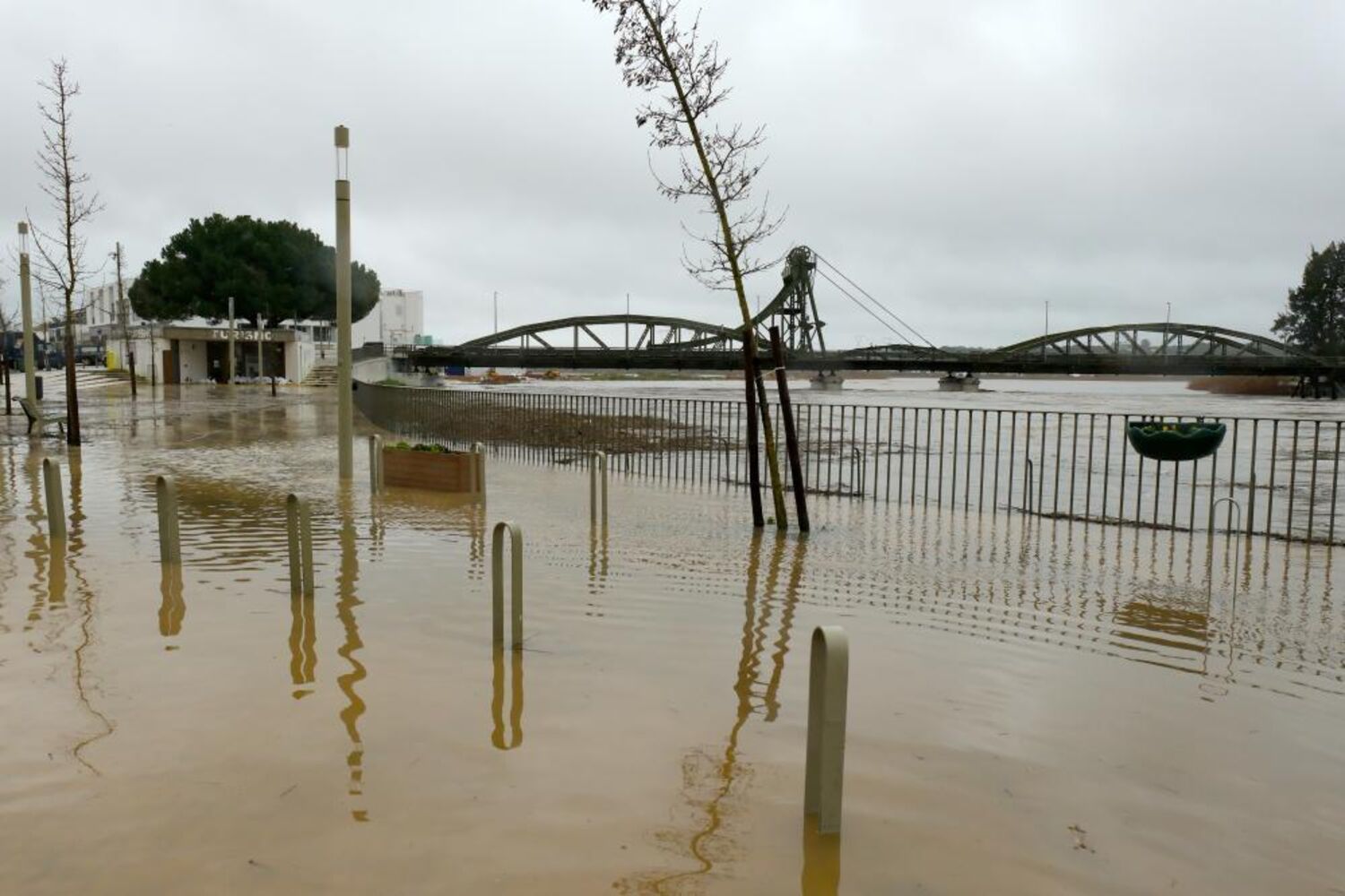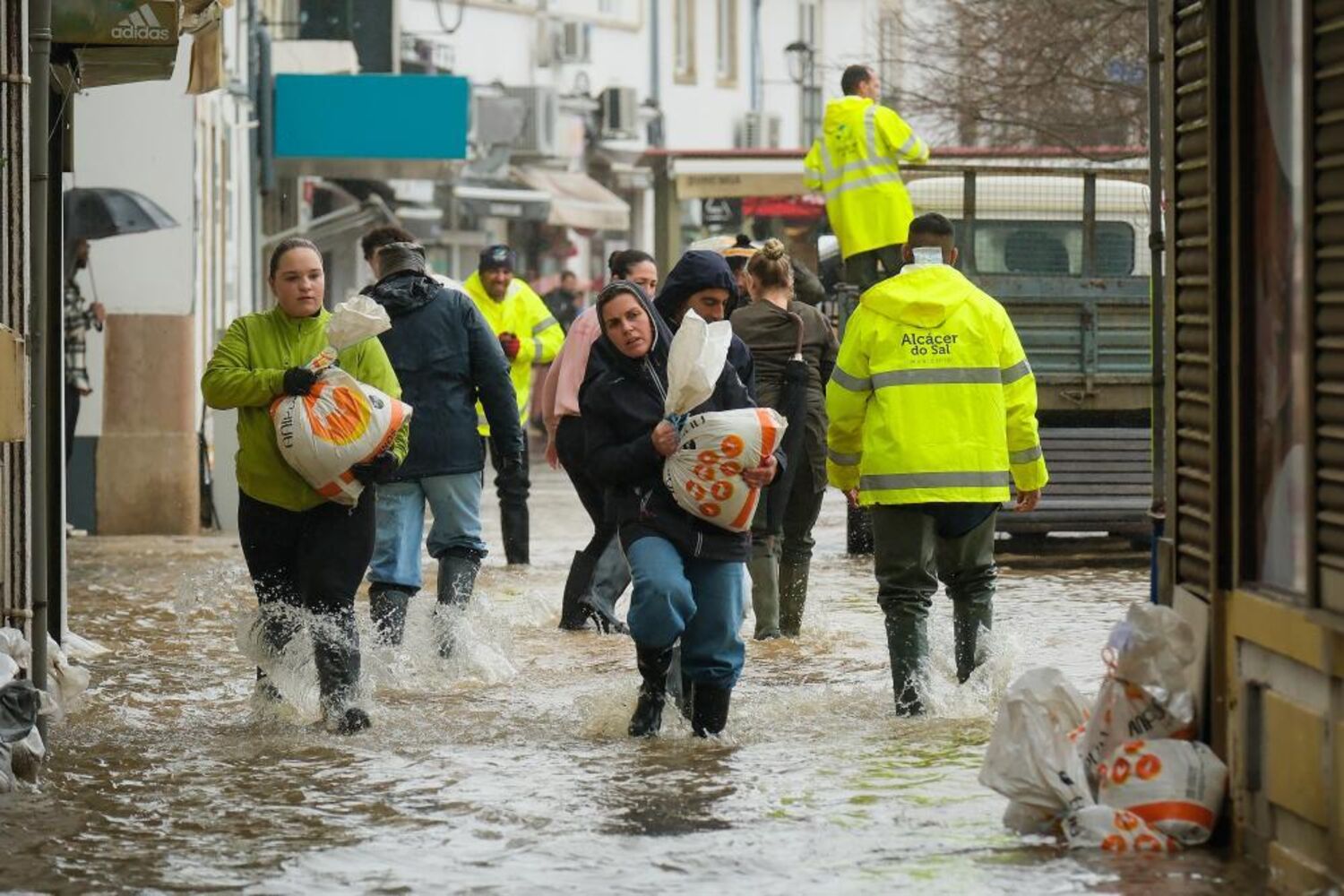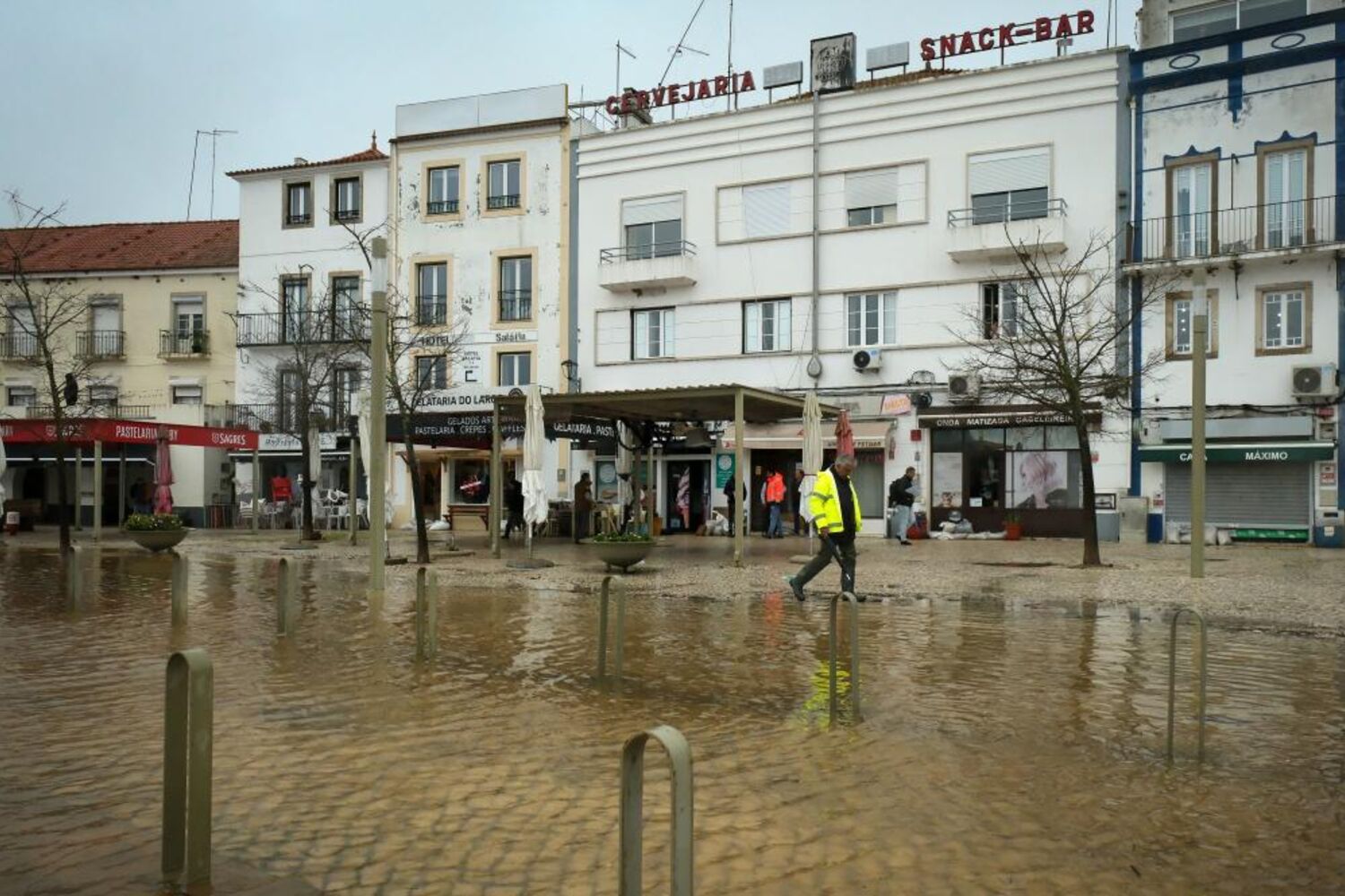O Rio Sado galgou a margem e inundou o Largo Luís de Camões, afetando lojas, restaurantes, cafés e salões de beleza aí localizados.
