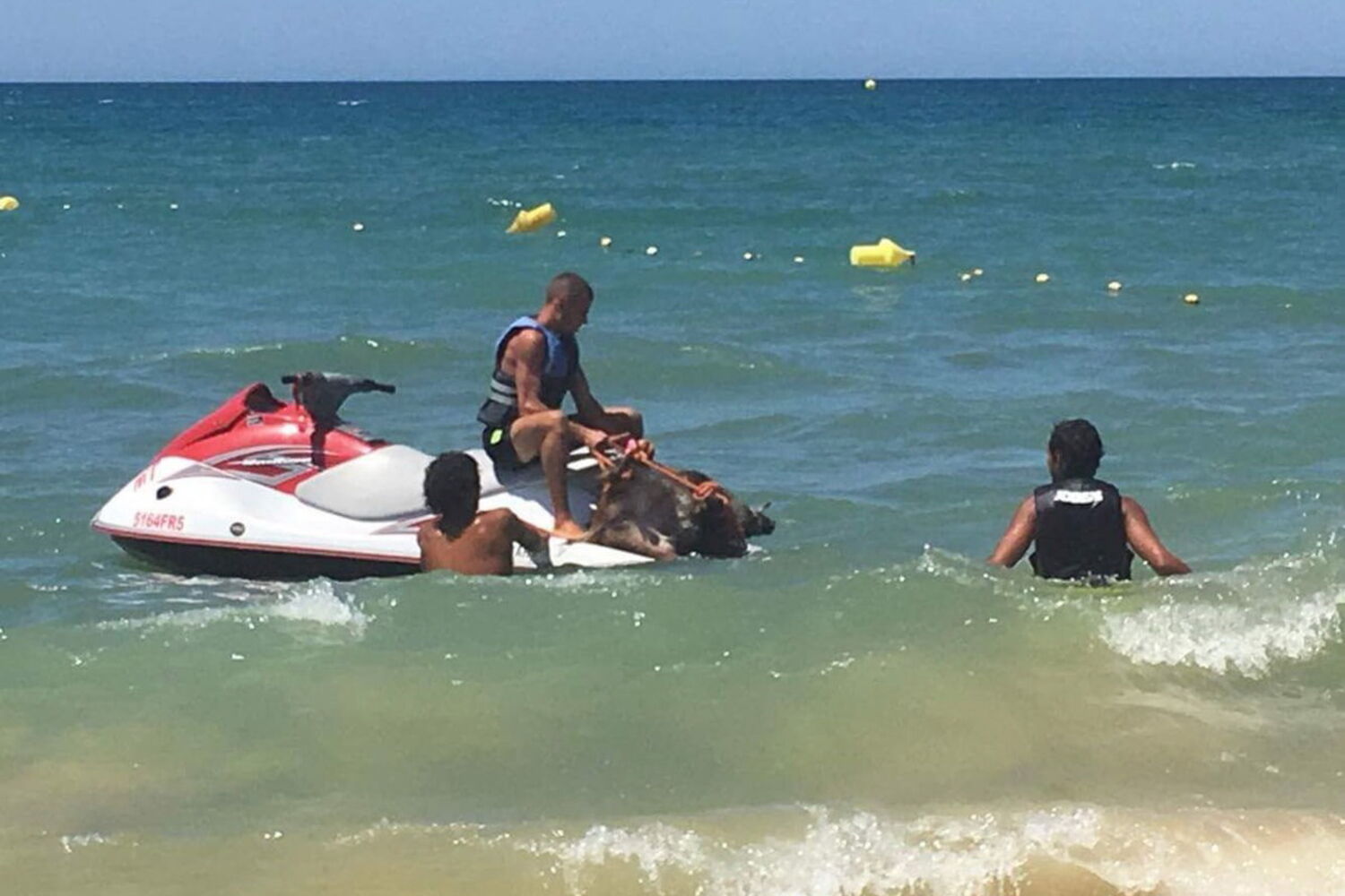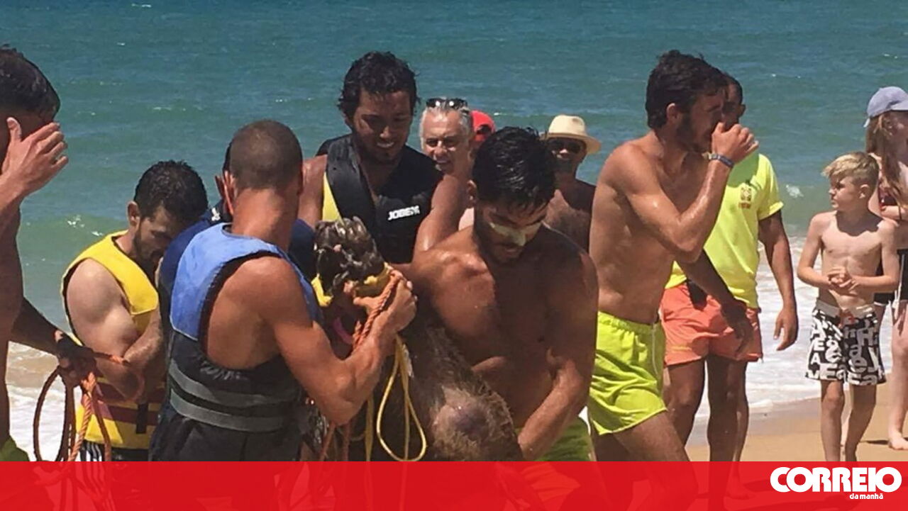 "Quando chegámos ao local a primeira coisa que fizemos foi amarrar-lhe a boca com uma corda, porque como é um animal selvagem podia ser perigoso. Depois, conseguimos puxá-lo para cima da mota de água para o trazermos para a praia", explicou Tiago Gomes, que confessa ter sido "um dia estranho" mas "engraçado".